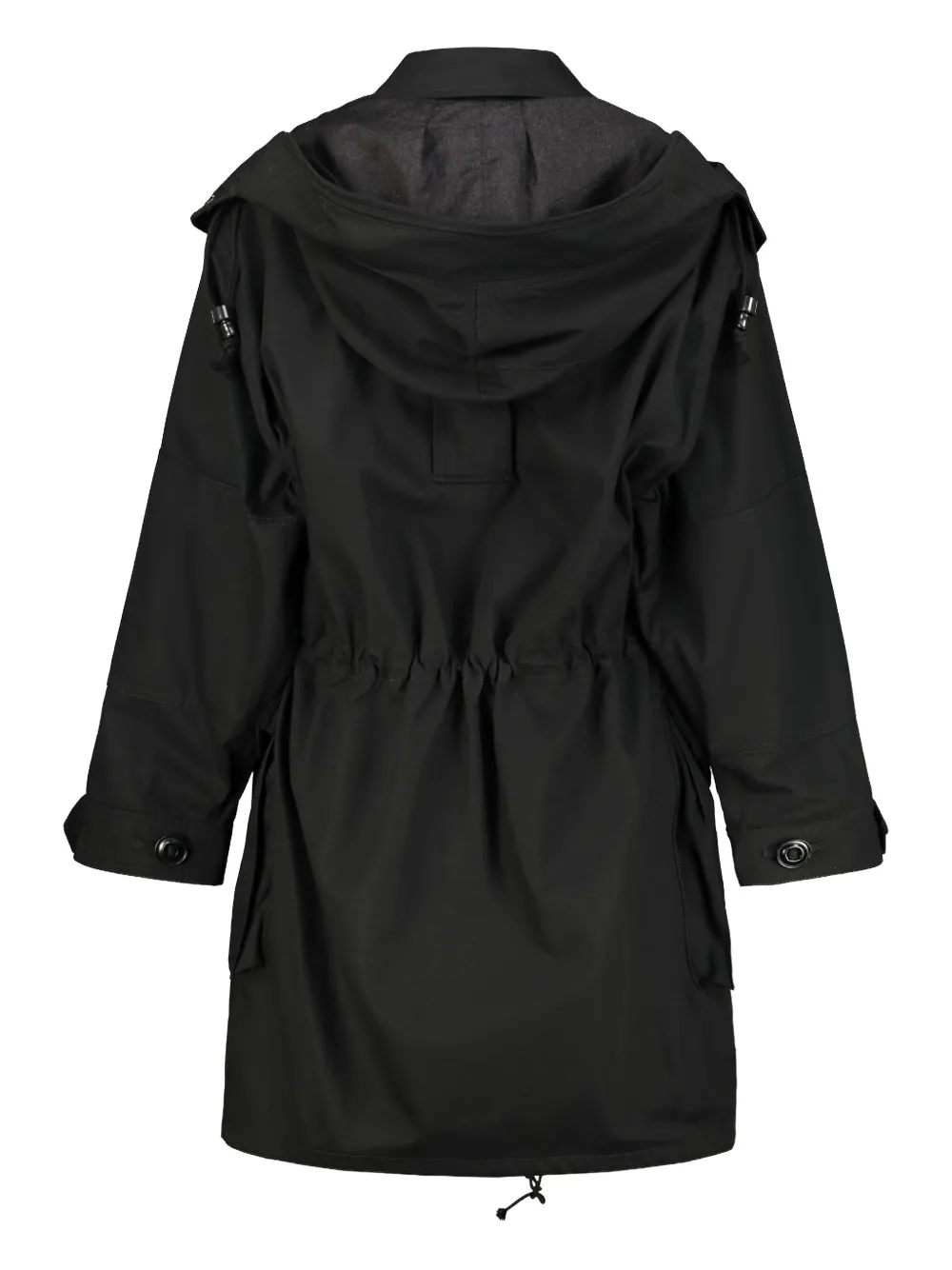 черный цвет, застежка на пуговицы, съемный капюшон, накладные карманы спереди с клапанами, длинные рукава, манжеты на пуговицах, кулиска по нижнему краю