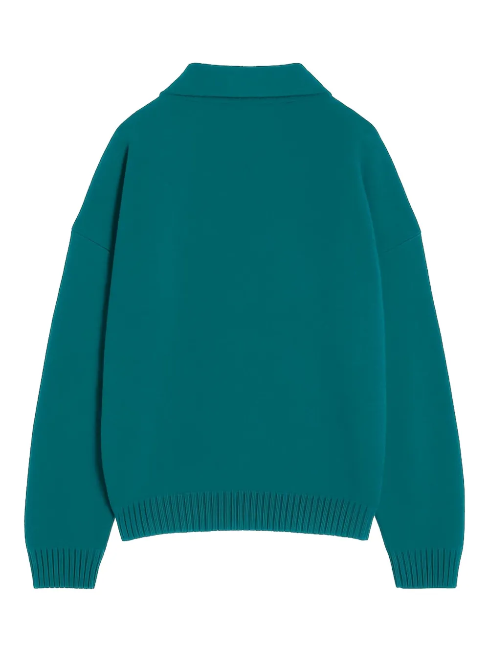 темно-зеленый пуловер с рубчатым подолом, отложным воротником поло, короткой застежкой на пуговицы и длинными рукавами