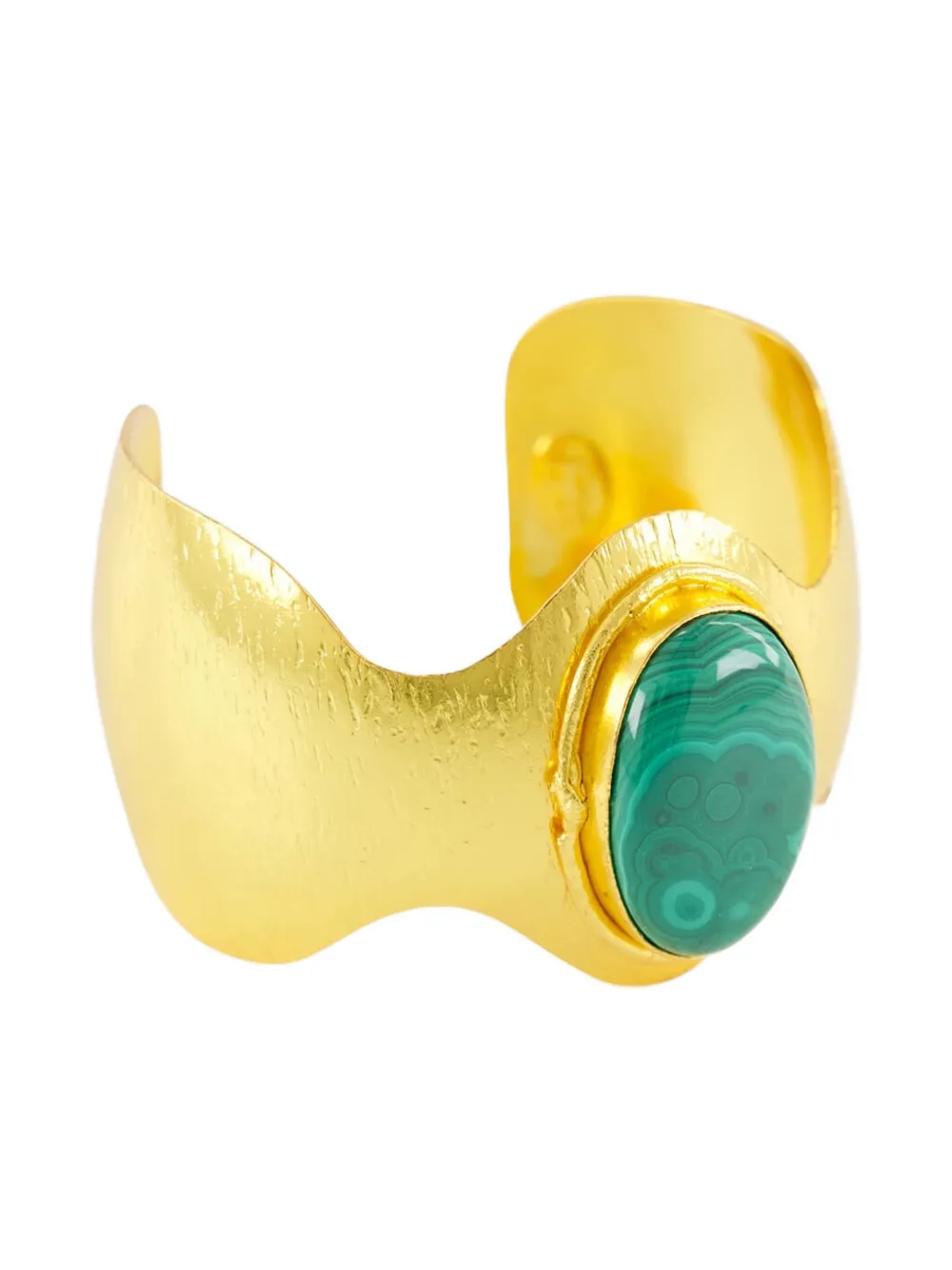 золотисто-зеленый браслет-кафф с малахитом Обычное ежедневное использование и воздействие внешних факторов могут снизить блеск драгоценных камней и золота.