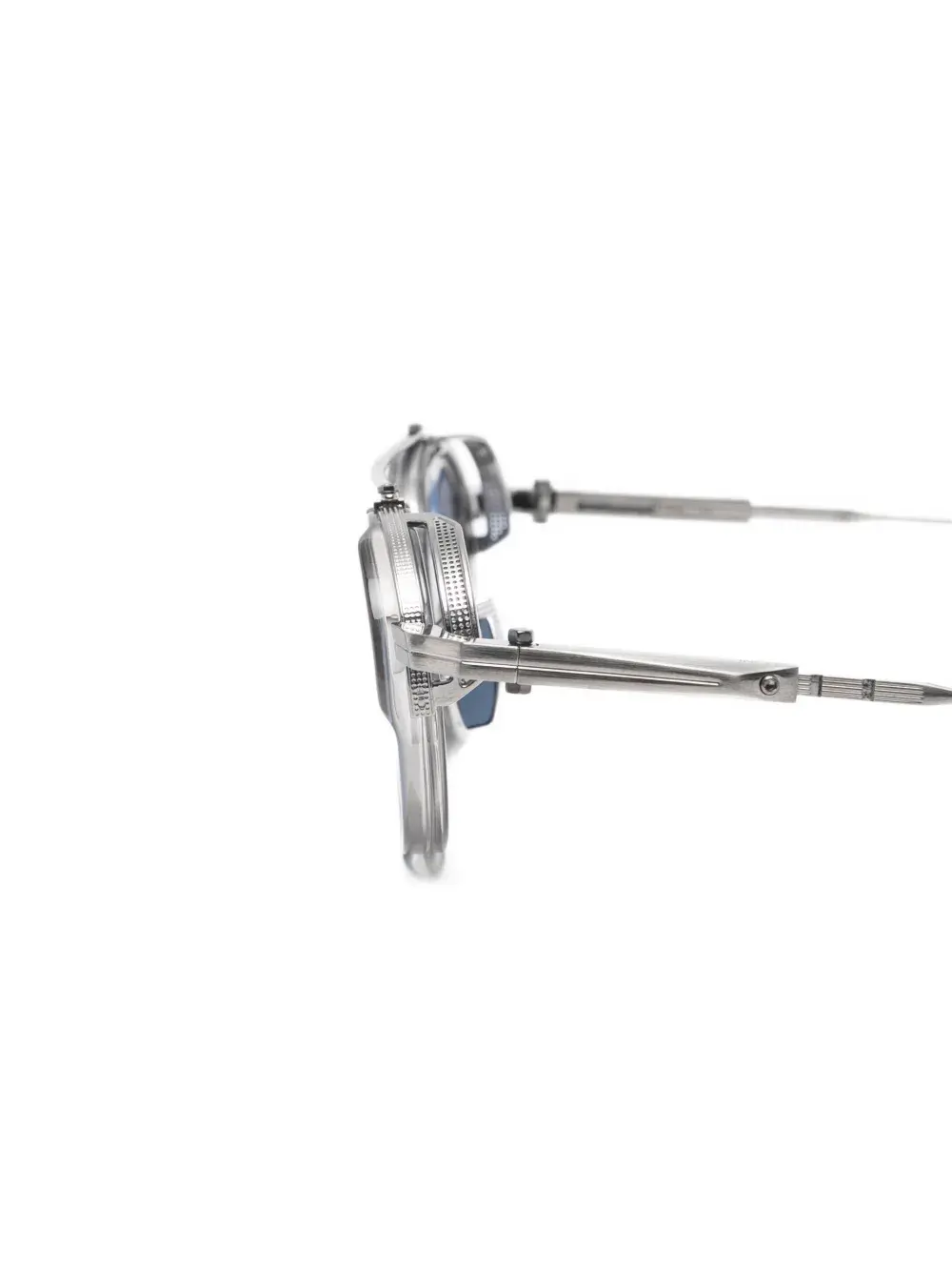 серебристые носоупоры, тонированные линзы, тонкие дужки.