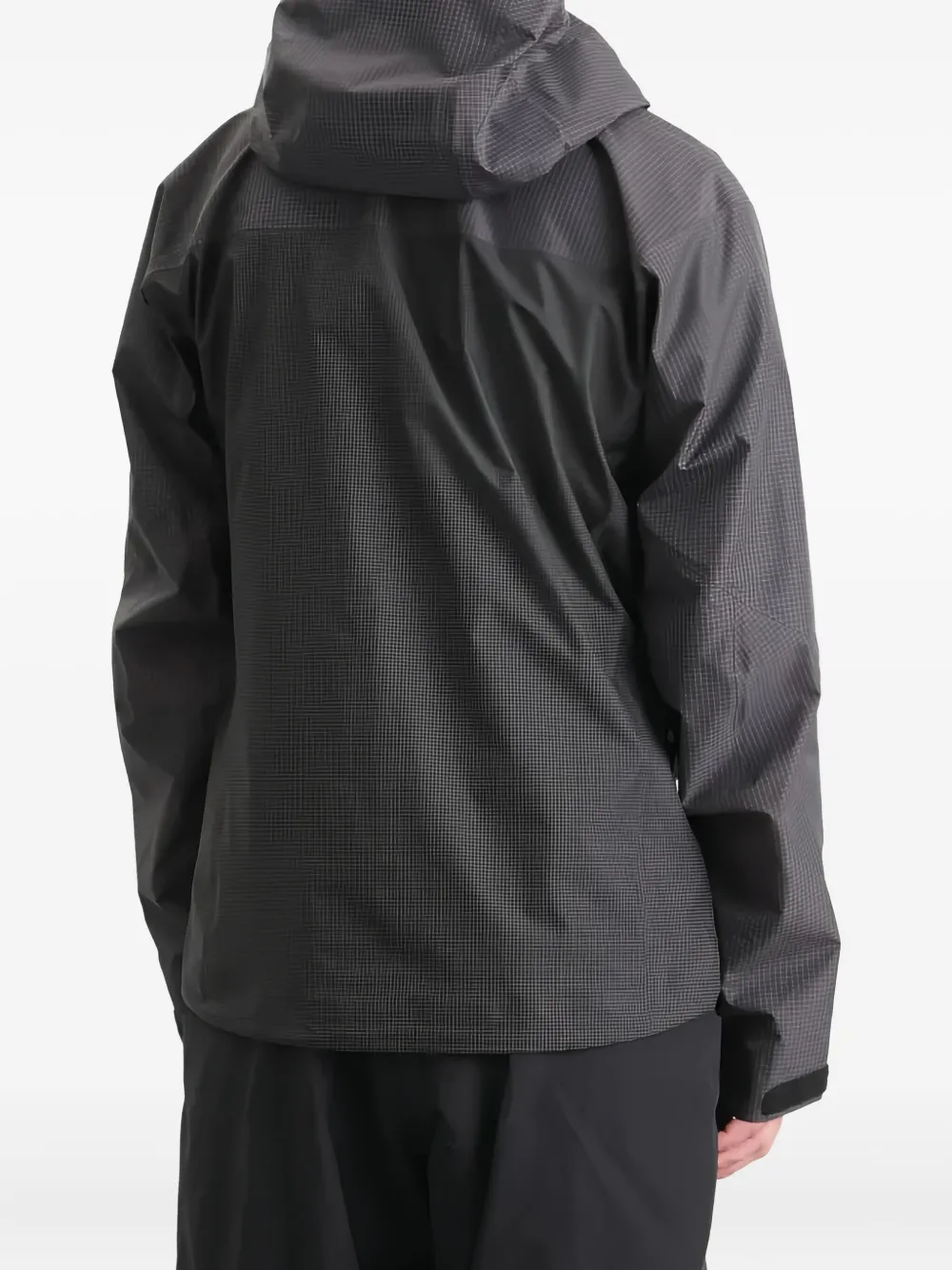черная куртка с клетчатым узором, застежкой-молнией, капюшоном, длинными рукавами и передними карманами на молнии
