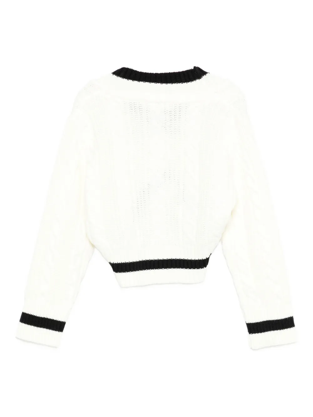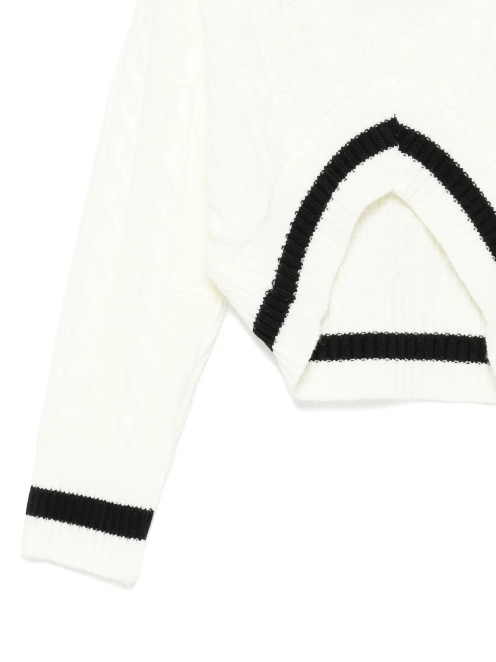белый вязаный свитер с V-образным вырезом, длинными рукавами и полосатой отделкой