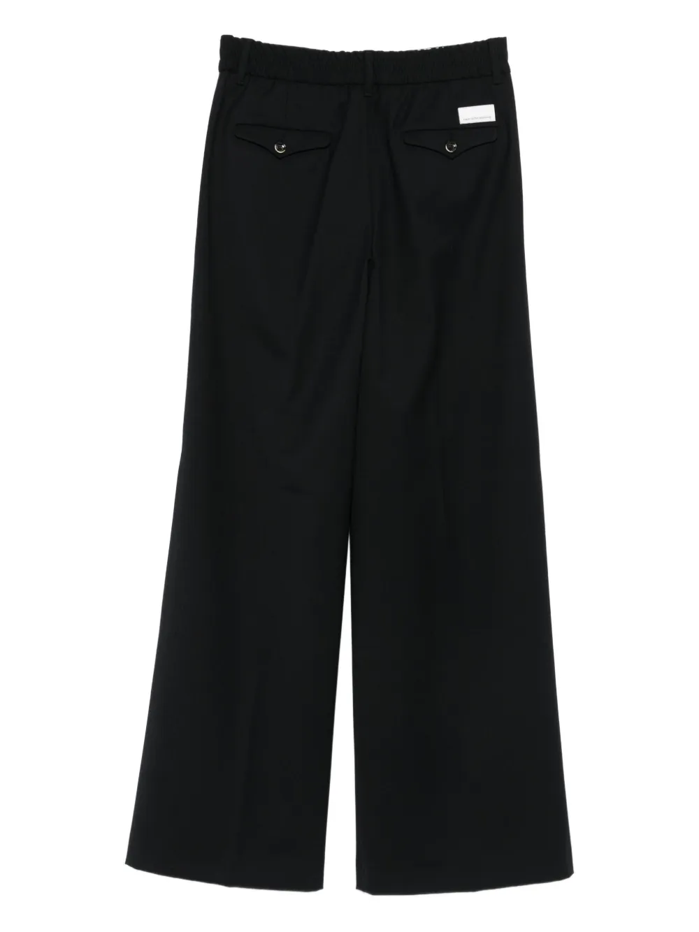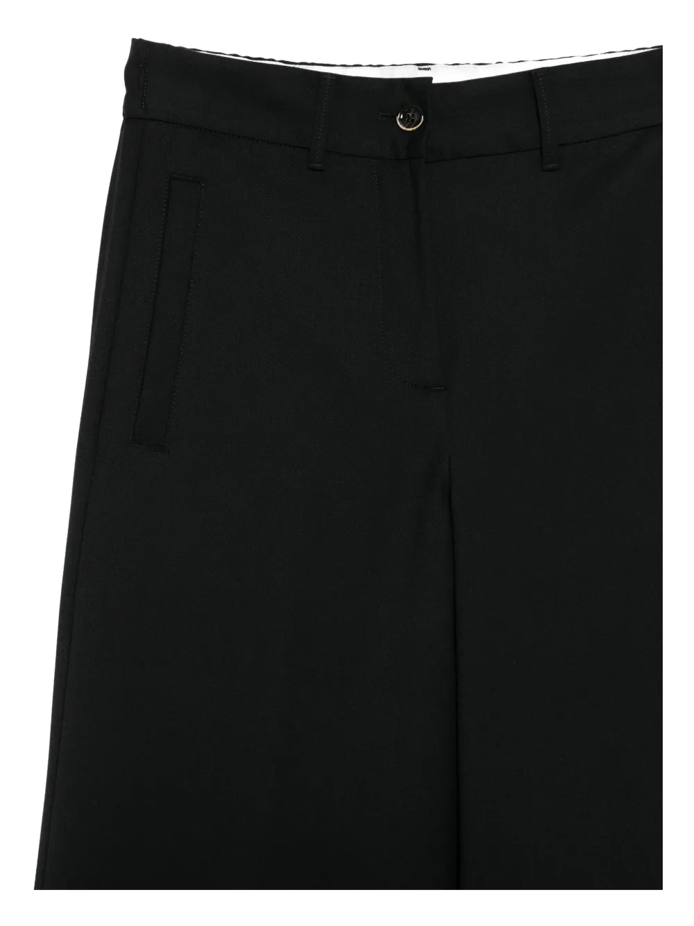 чёрные брюки с застёжкой на пуговицы, боковыми прорезными карманами, шлёвками для ремня, задними карманами на пуговицах и нашивкой с логотипом