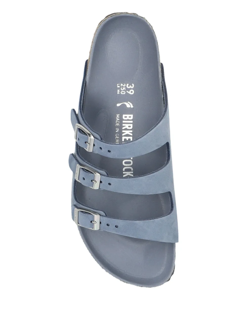 верх из нубуковой кожи синего каменного цвета, три ремешка, застежка-пряжка, пробковая промежуточная подошва, плоская подошва