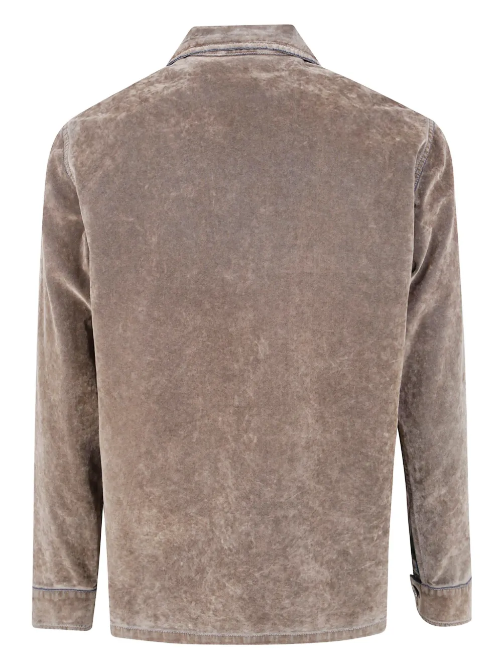 светло-серый цвет, два накладных кармана на груди, длинные рукава, застежка на пуговицах, отложной воротник, манжеты на пуговицах