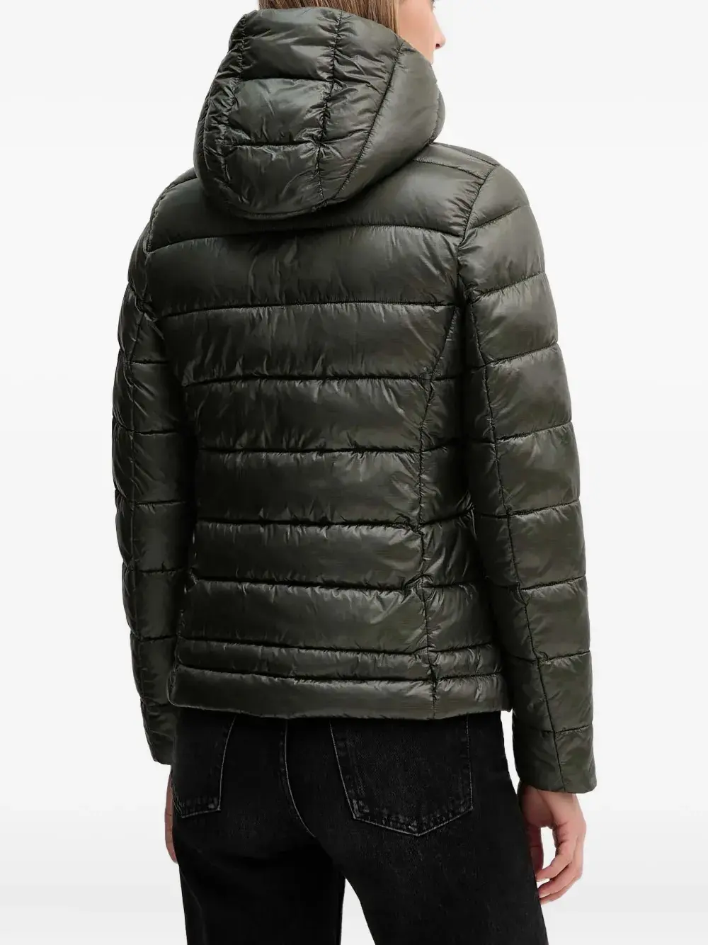 темно-зеленый стеганый дизайн, капюшон, застежка-молния, боковые карманы на молнии, нашивка с логотипом