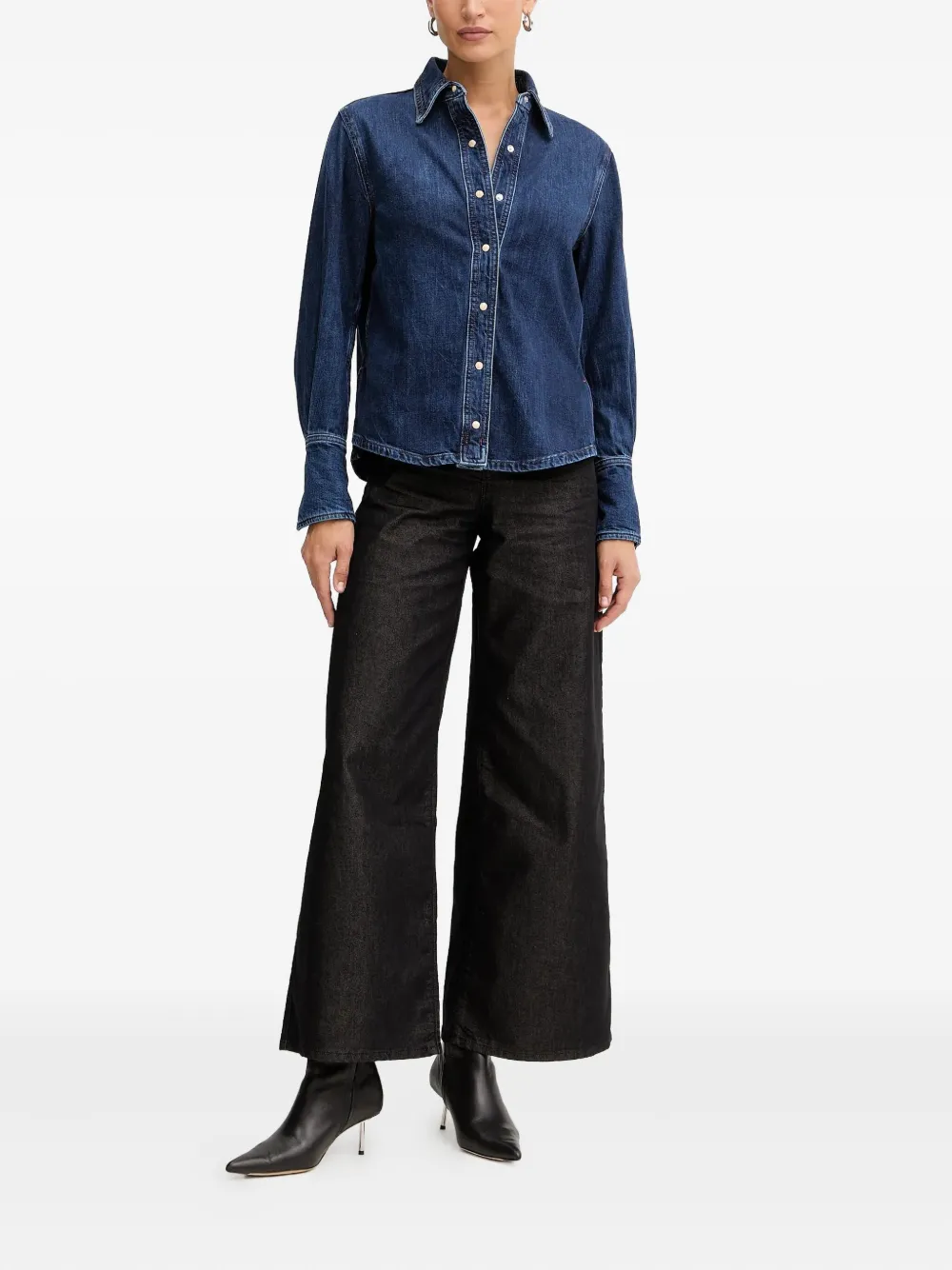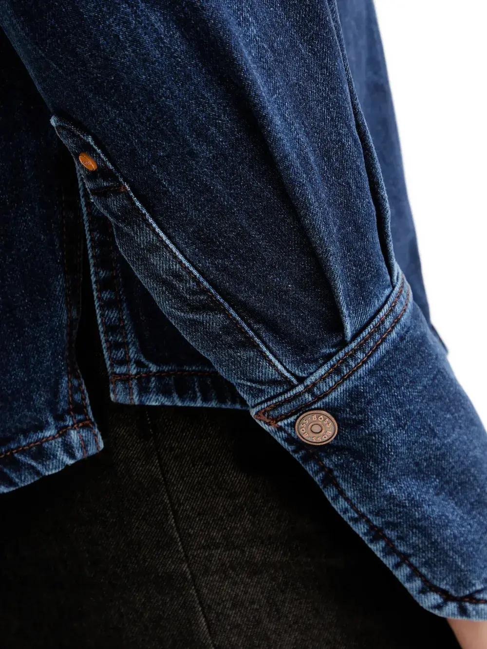 синяя рубашка с застежкой на пуговицы, длинными рукавами, отложным воротником, манжетами на пуговицах и кокеткой на спине