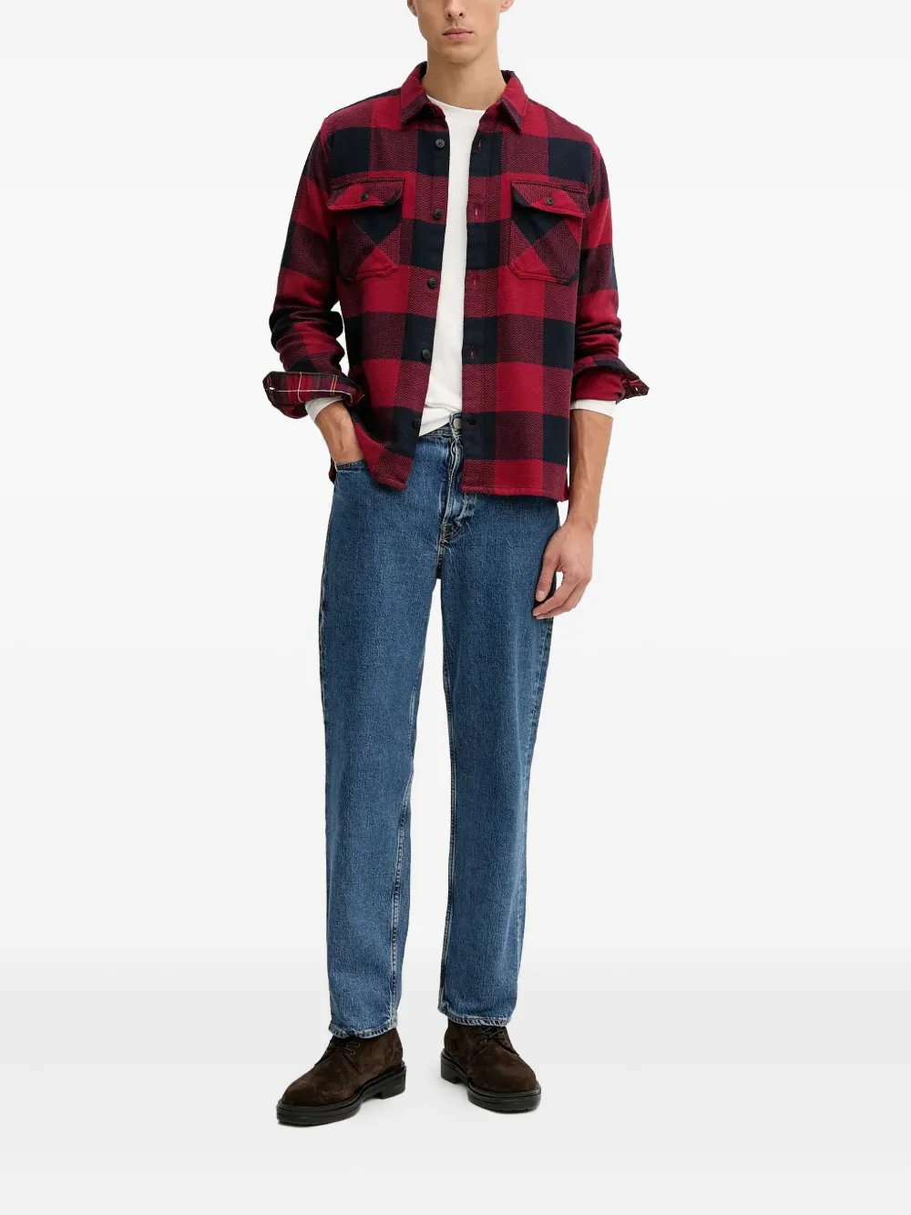 красная рубашка в клетку с застежкой на пуговицы, длинными рукавами и накладными карманами с клапанами