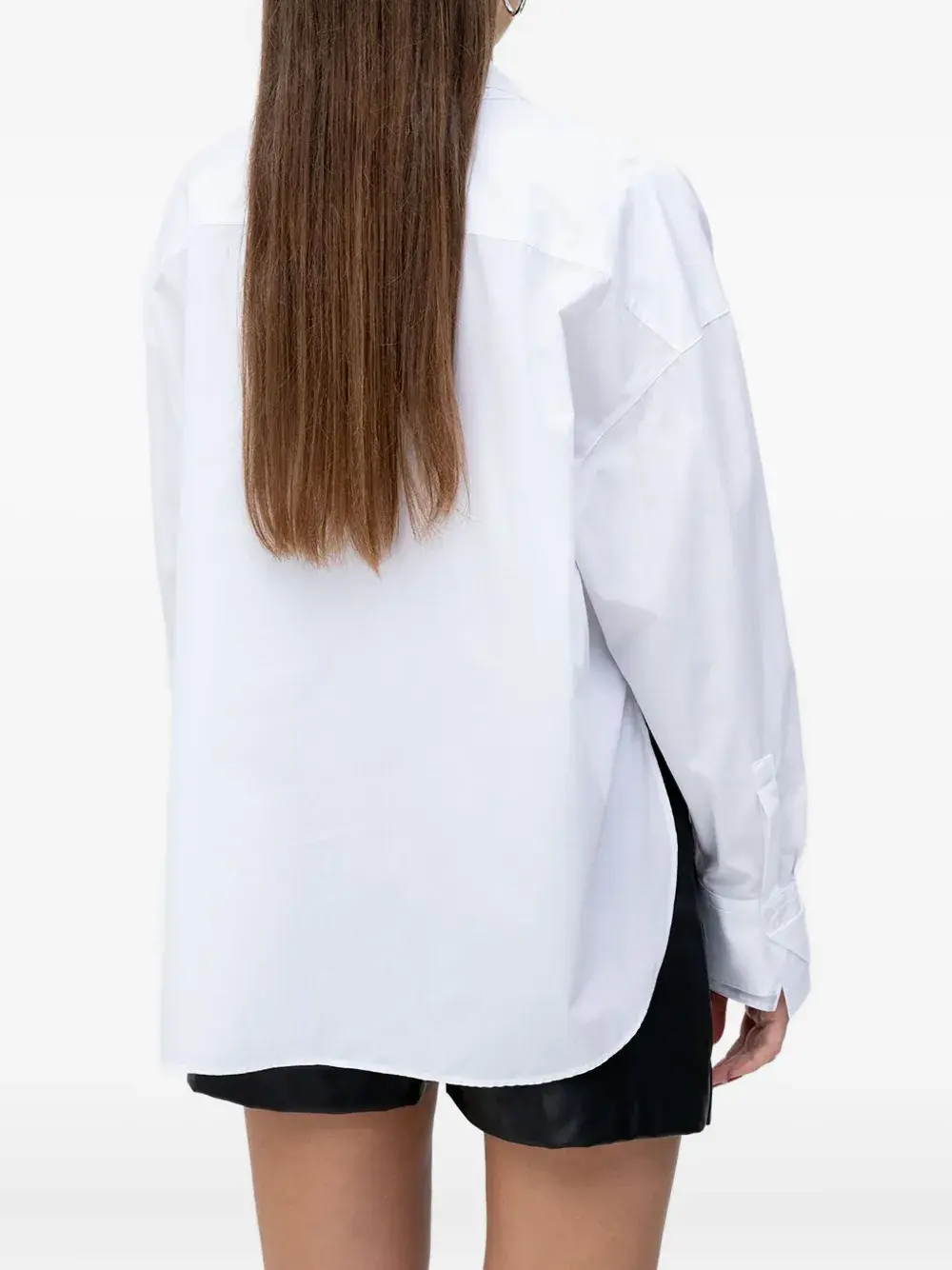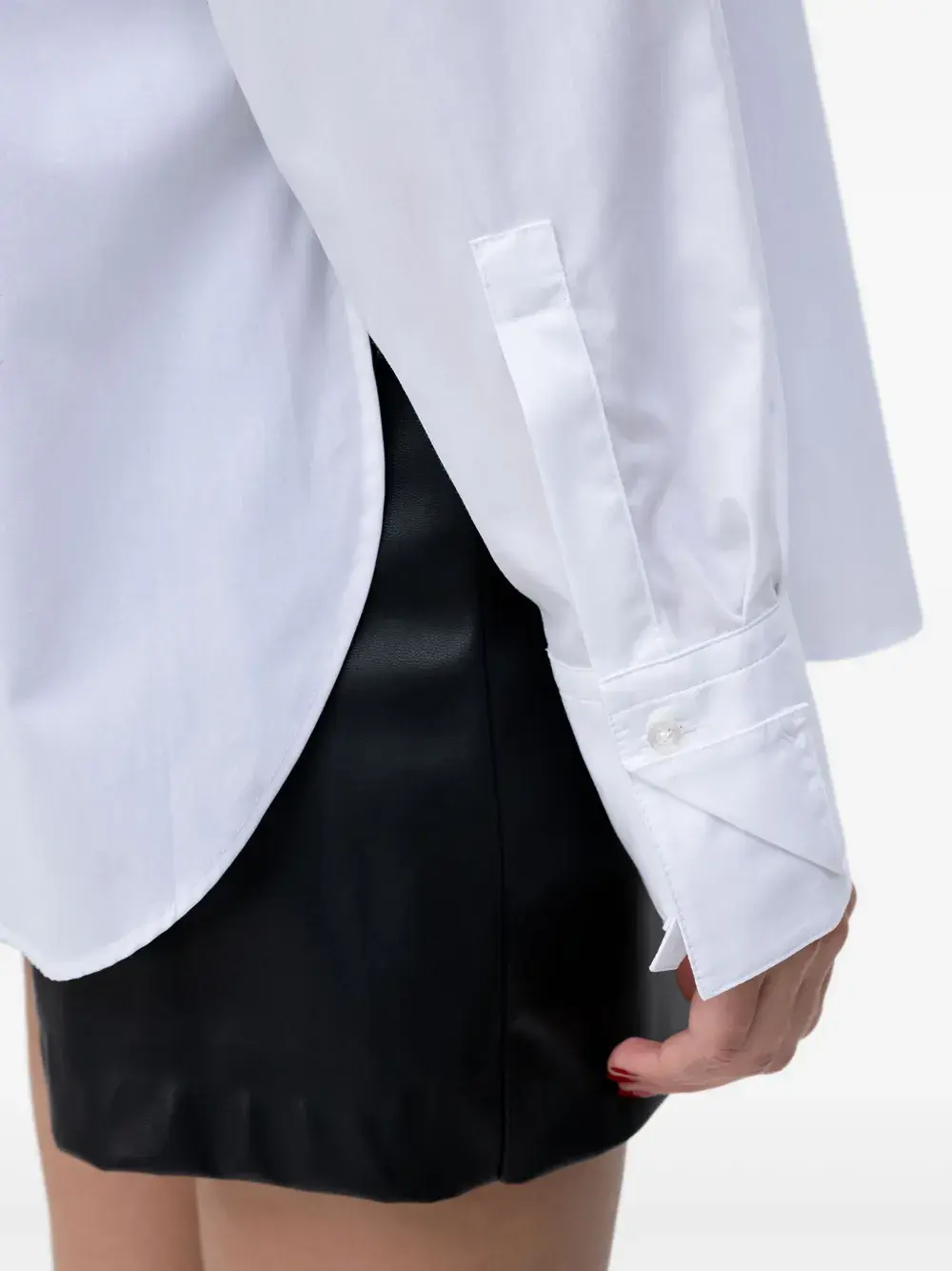 белая рубашка с застежкой на пуговицы, длинными рукавами, манжетами на пуговицах и закругленным подолом