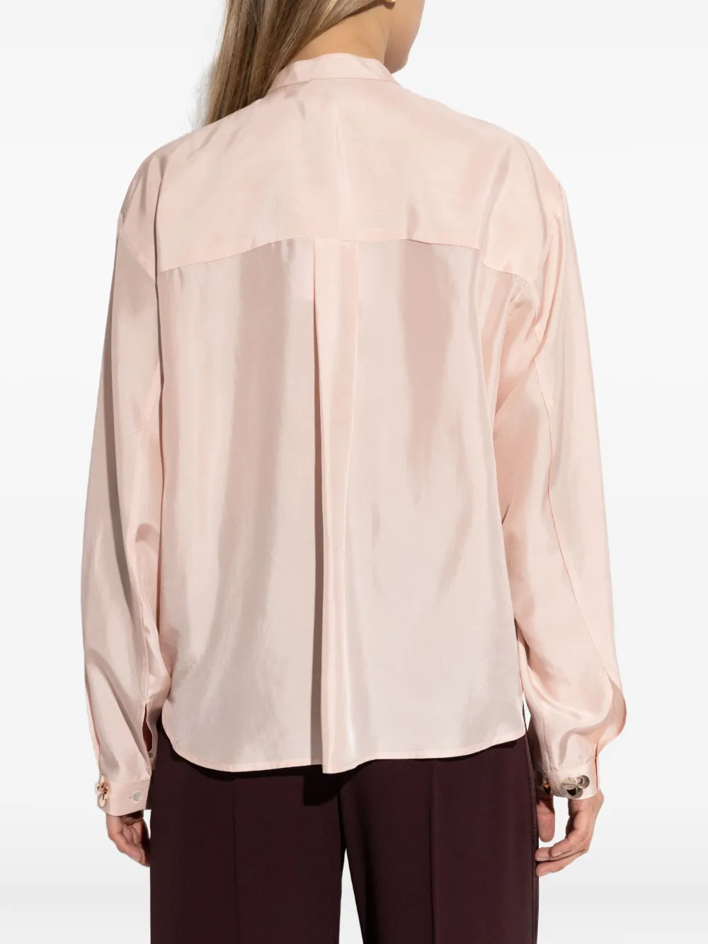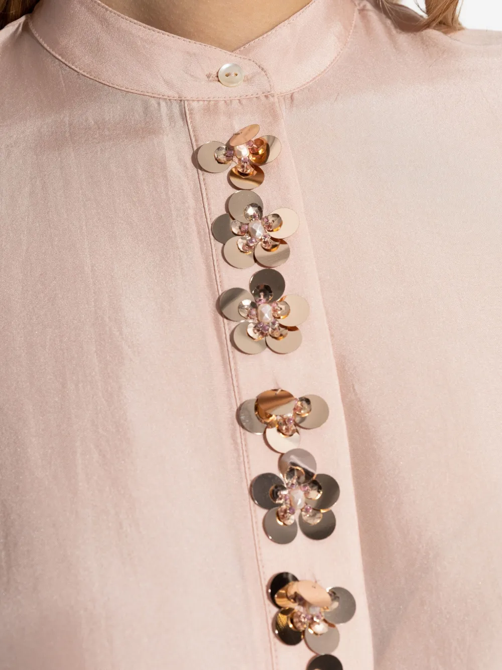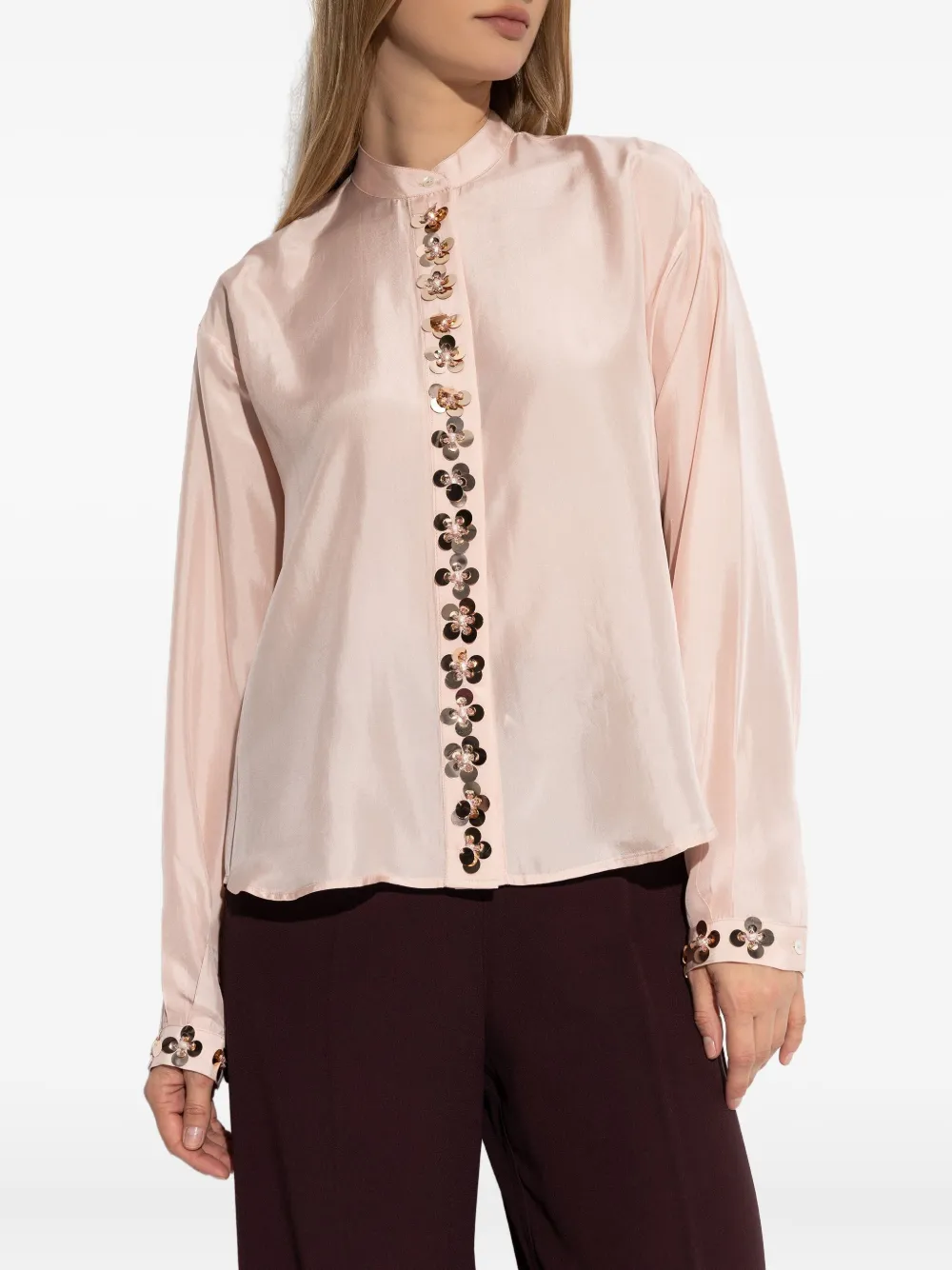 розовое украшение в виде цветка, застёжка на пуговицы, длинные рукава, манжеты на пуговицах, воротник-стойка