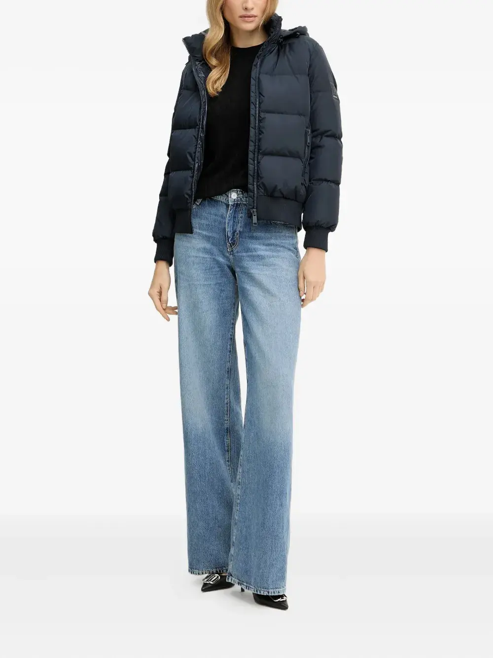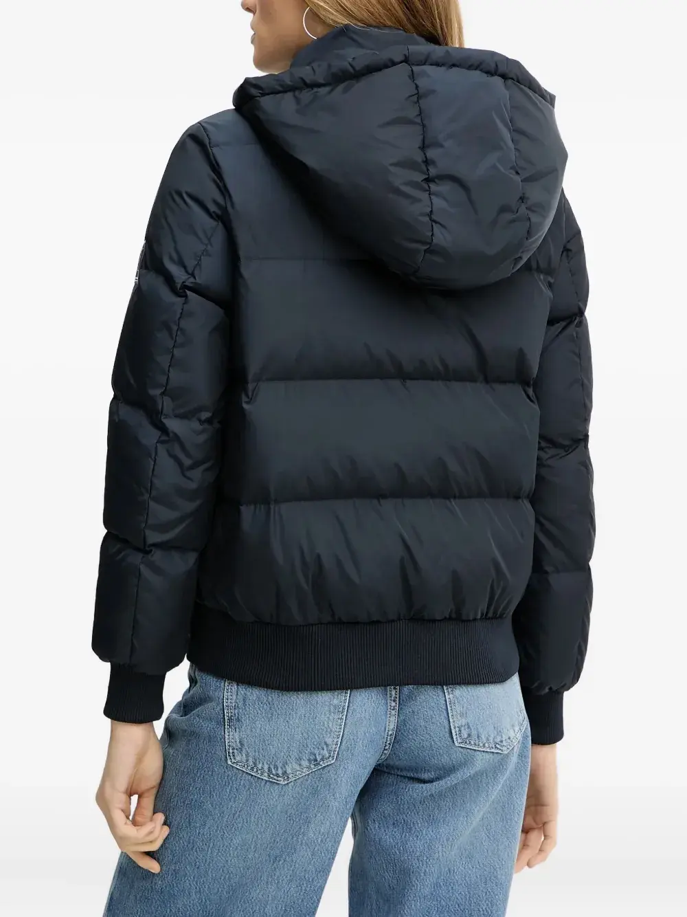 темно-синий цвет, стеганый дизайн, капюшон, застежка-молния, ребристый низ, нашивка с логотипом