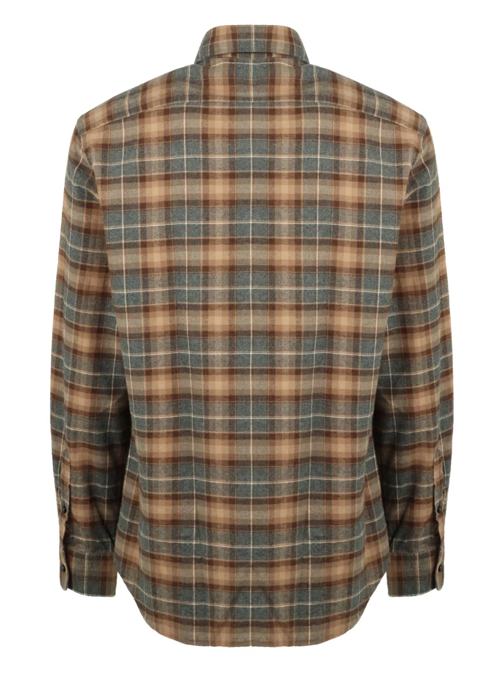 коричневая рубашка в клетку с классическим воротником, застежкой на пуговицы и длинными рукавами