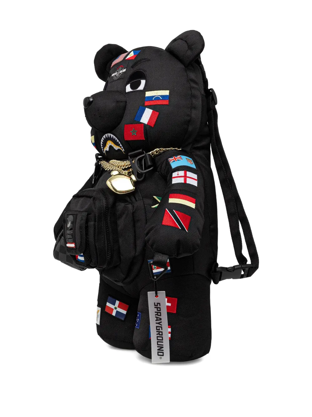 черные флаговые нашивки, застежка-молния, регулируемые лямки, верхняя ручка, передний карман, цепочка-декор, форма медведя, украшение в виде доллара