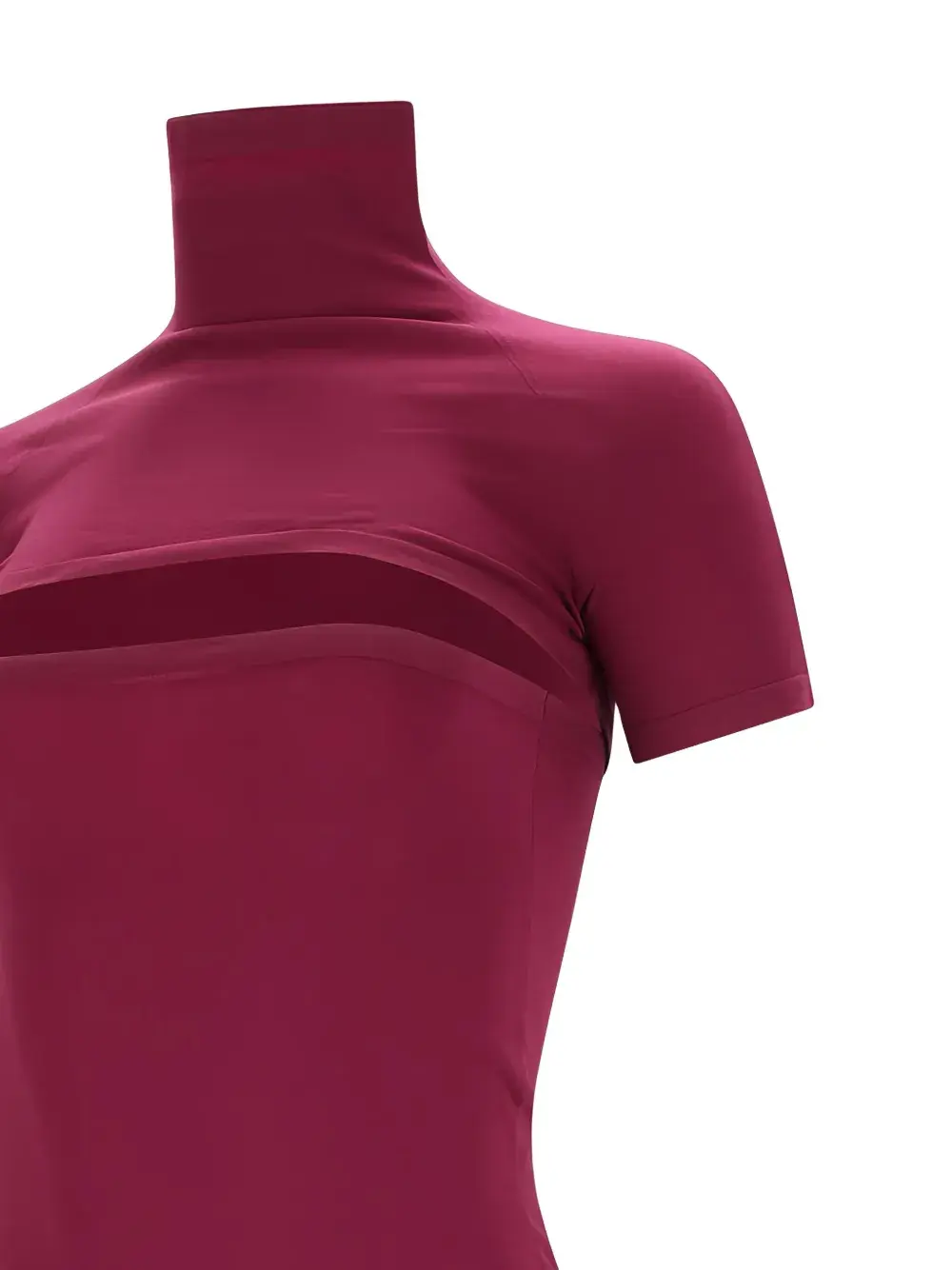 бордовое платье с высоким воротом, короткими рукавами, вырезами и прямым подолом средней длины