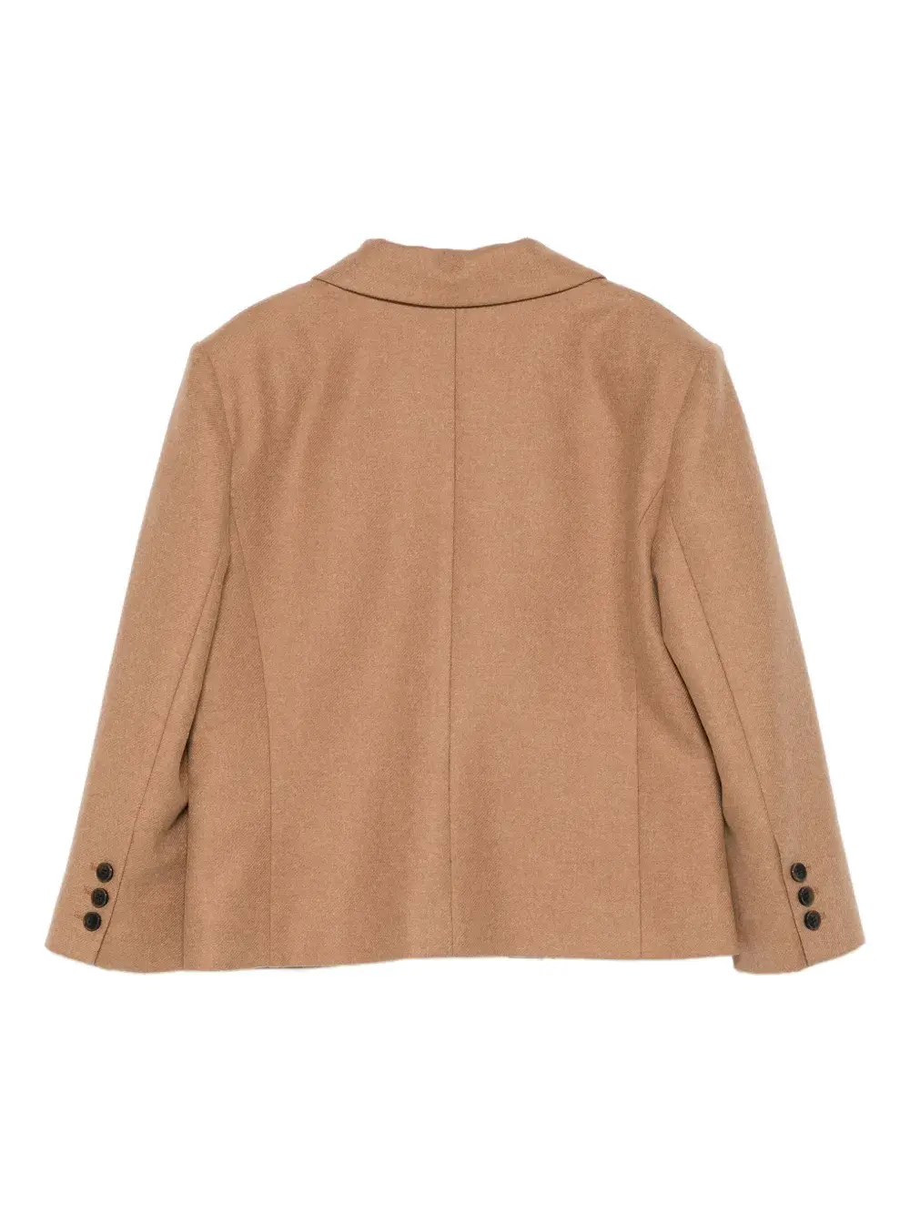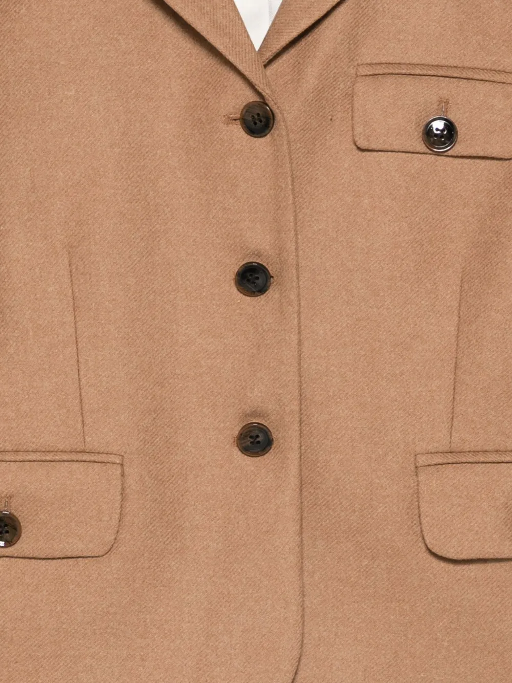 коричневый цвет, застёжка на пуговицы, лацканы с вырезом, передние карманы с пуговицами, подплечники, отделка вытачками, внутренний карман