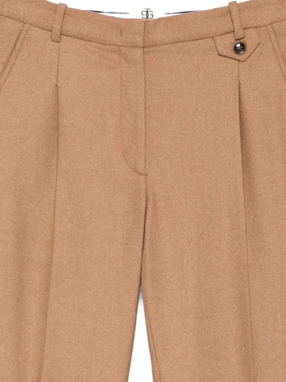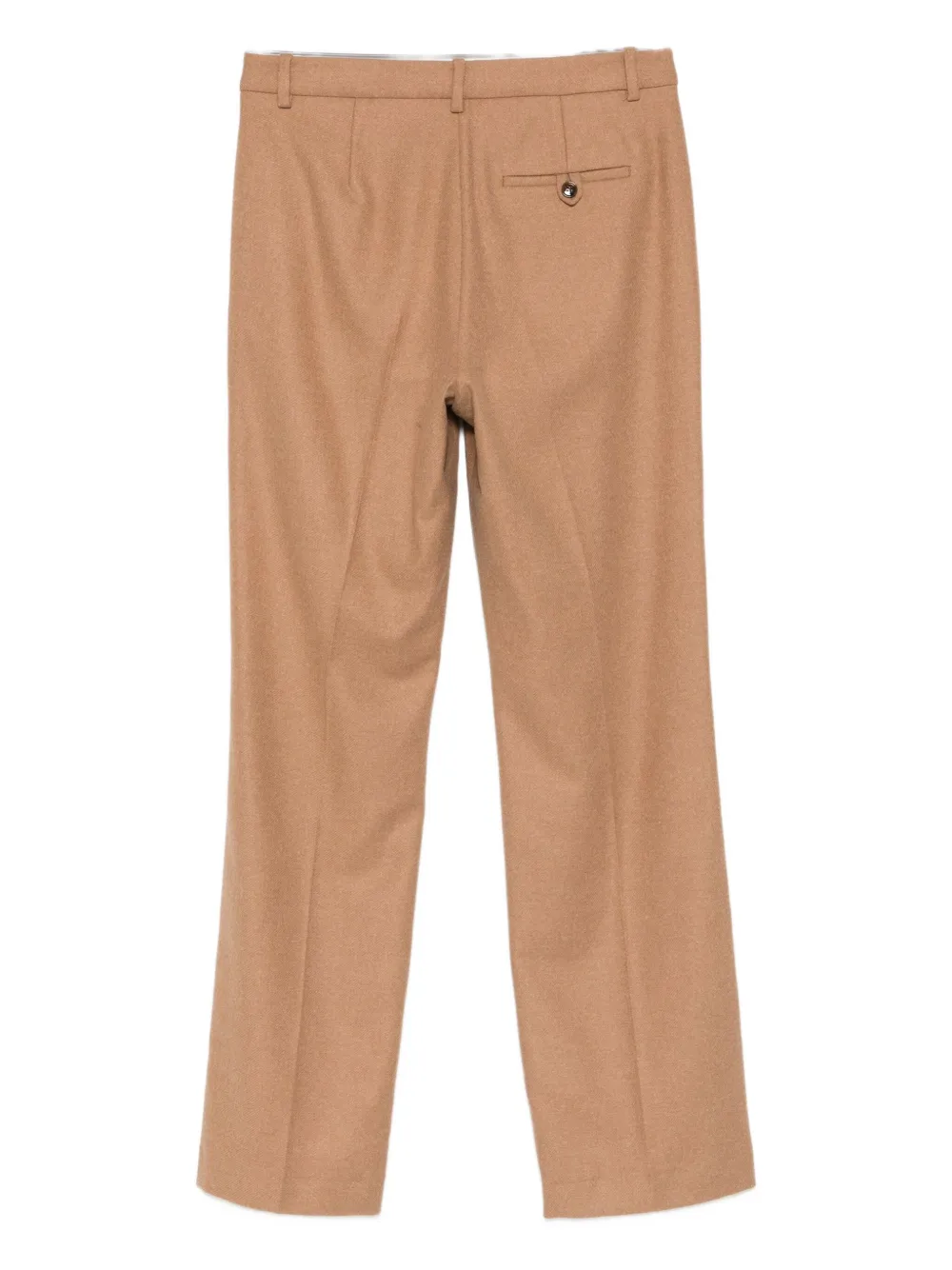 коричневый цвет, потайная застёжка на пуговицы спереди, застежка на крючок и молнию, шлевки для ремня, диагональные карманы по бокам, шлевки для ремня, задний карман на пуговице, отделка складками