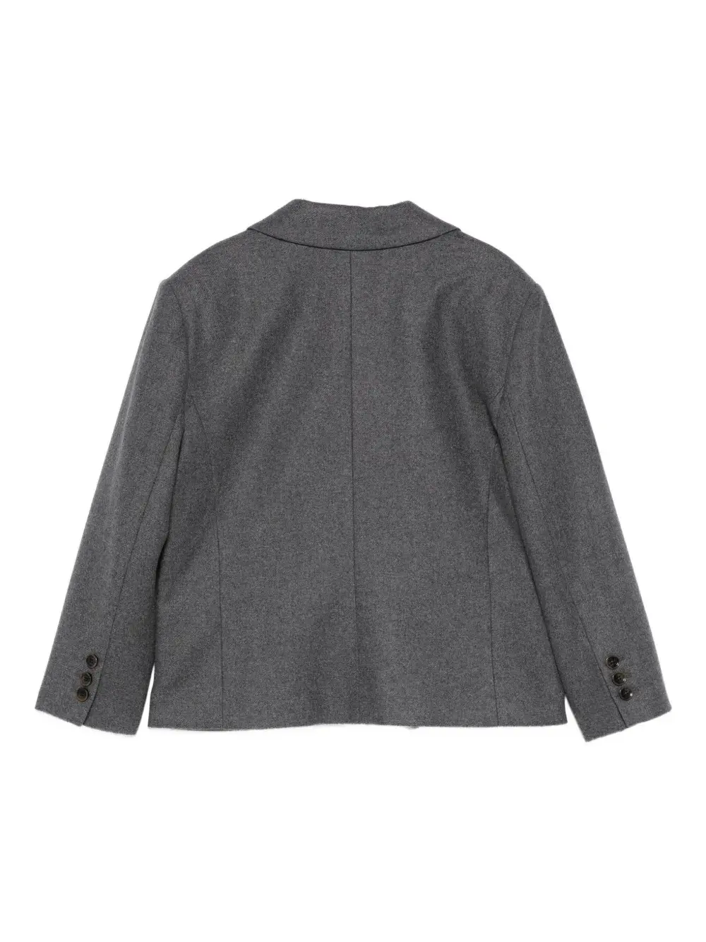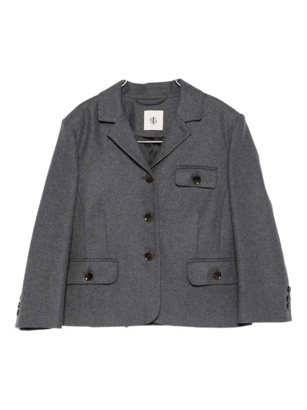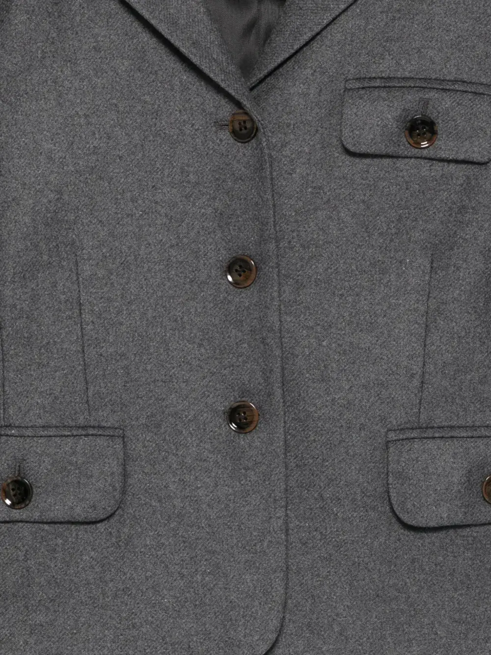 серый цвет, застежка на пуговицы, лацканы с вырезом, передние карманы с пуговицами, подплечники, вытачки, внутренний карман