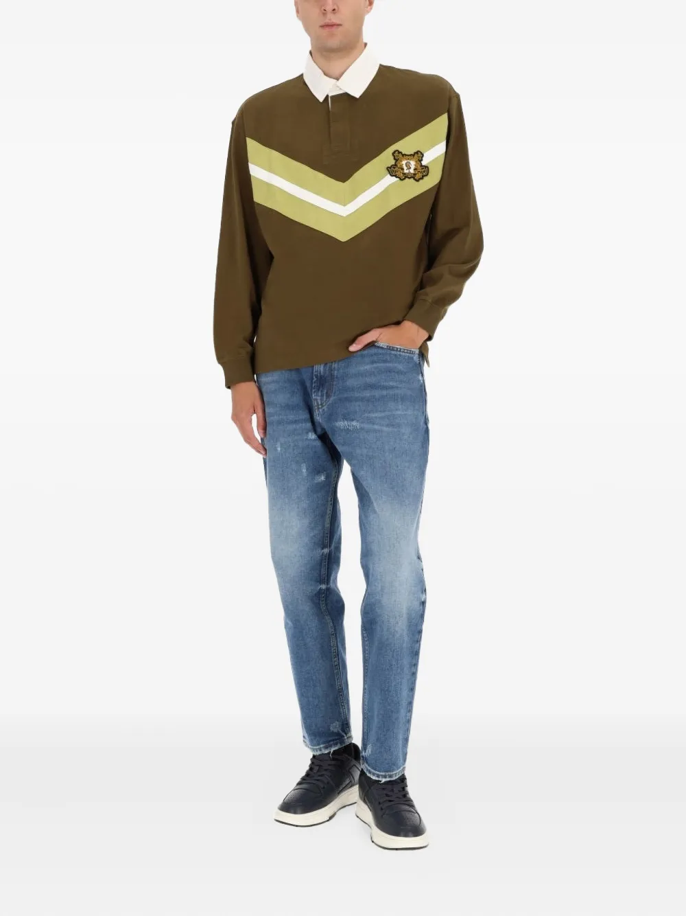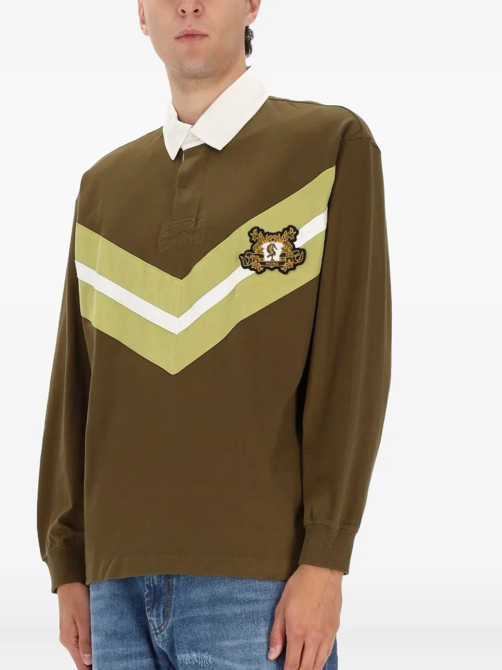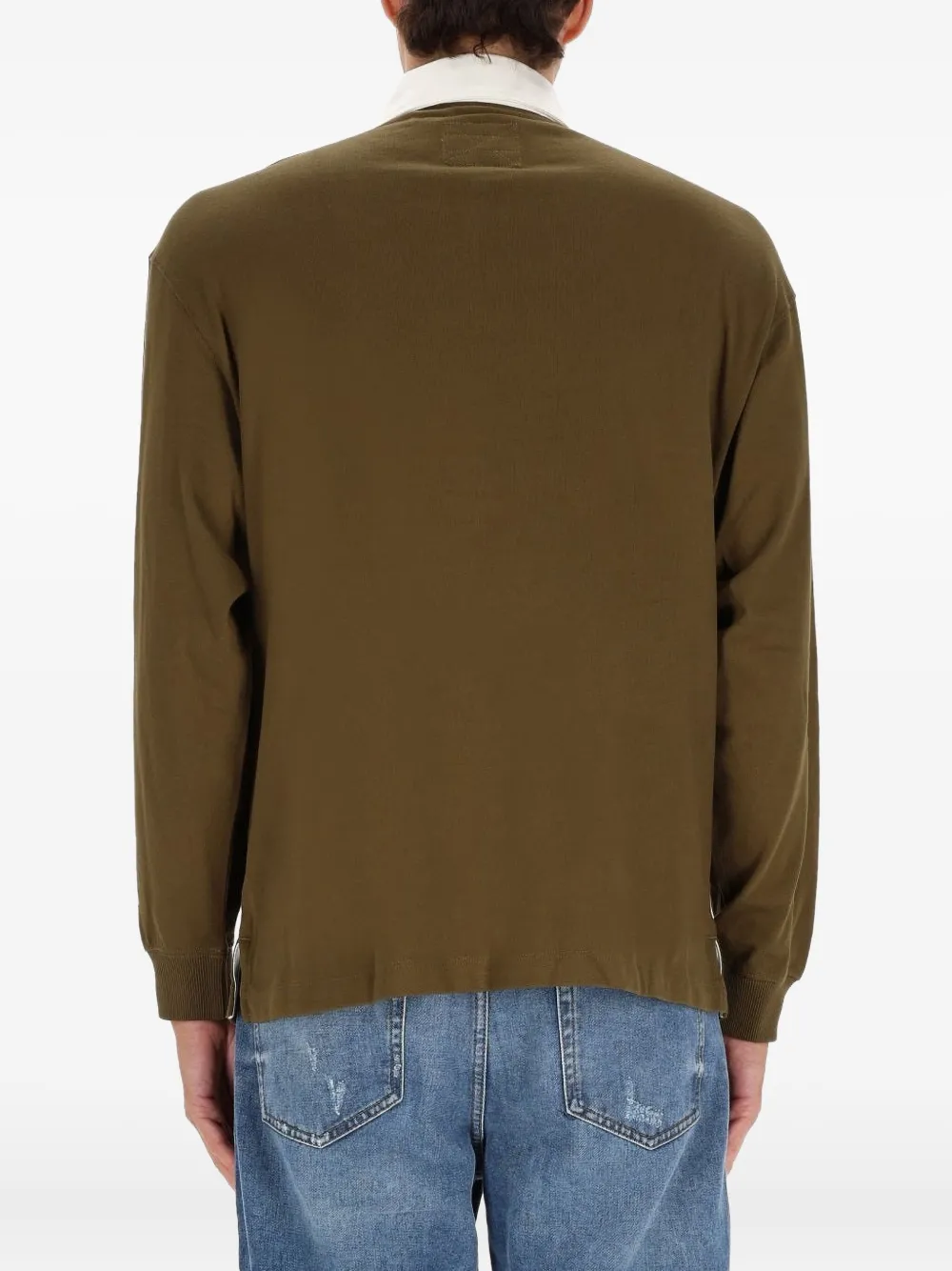 зелёное поло с воротником, нашивкой с логотипом, длинными рукавами и ребристыми манжетами