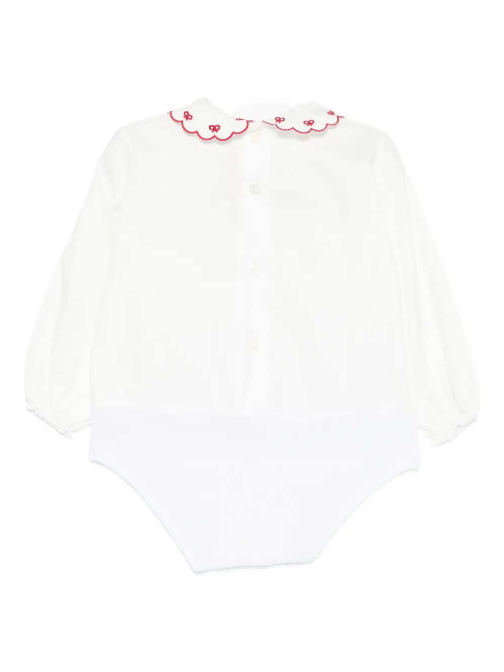 белый цвет, воротник с зубчатым краем, вышитые детали, длинные рукава, застежка на пуговицы сзади, эластичные манжеты