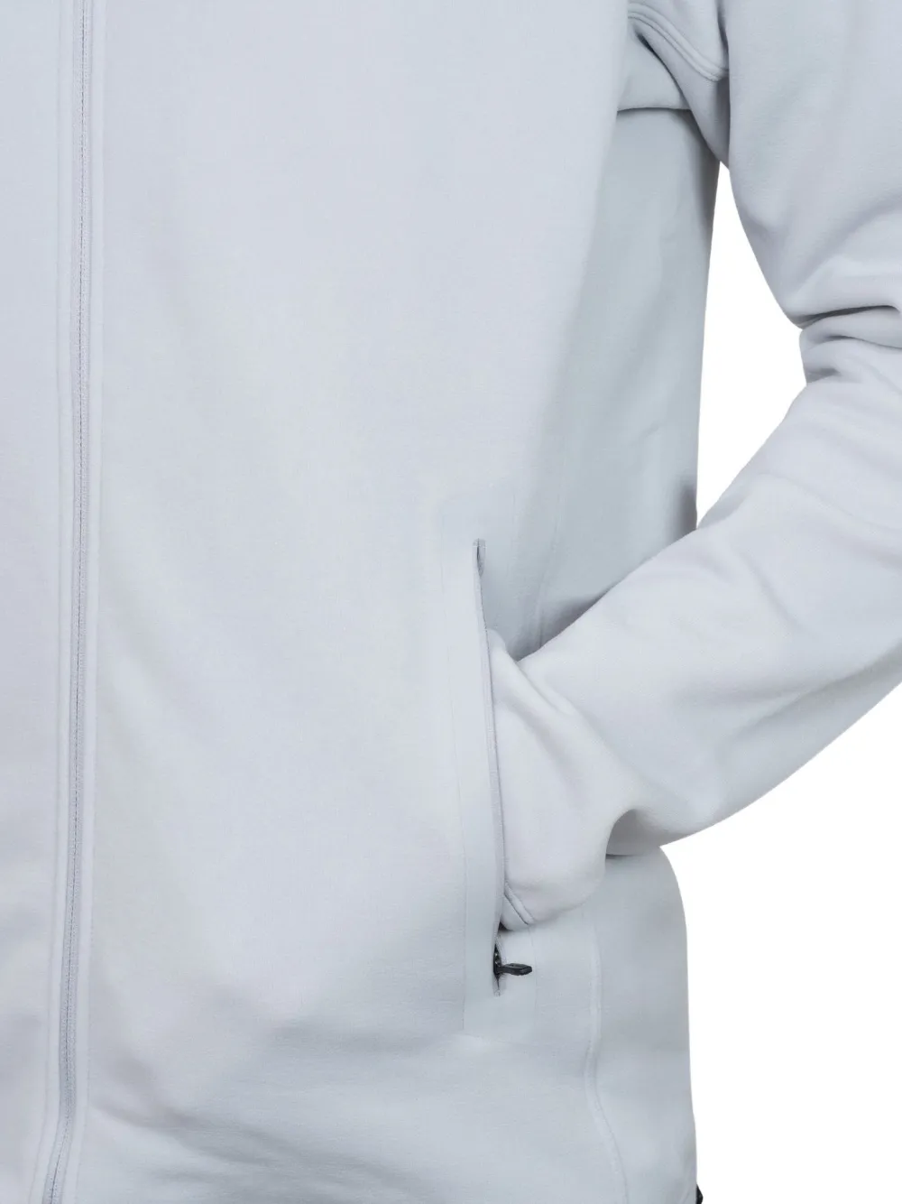 светло-серый цвет, логотип, застежка-молния, длинные рукава, боковые карманы на молнии, высокий воротник