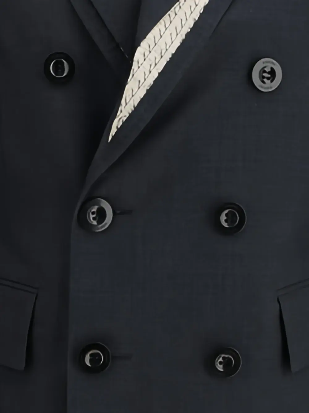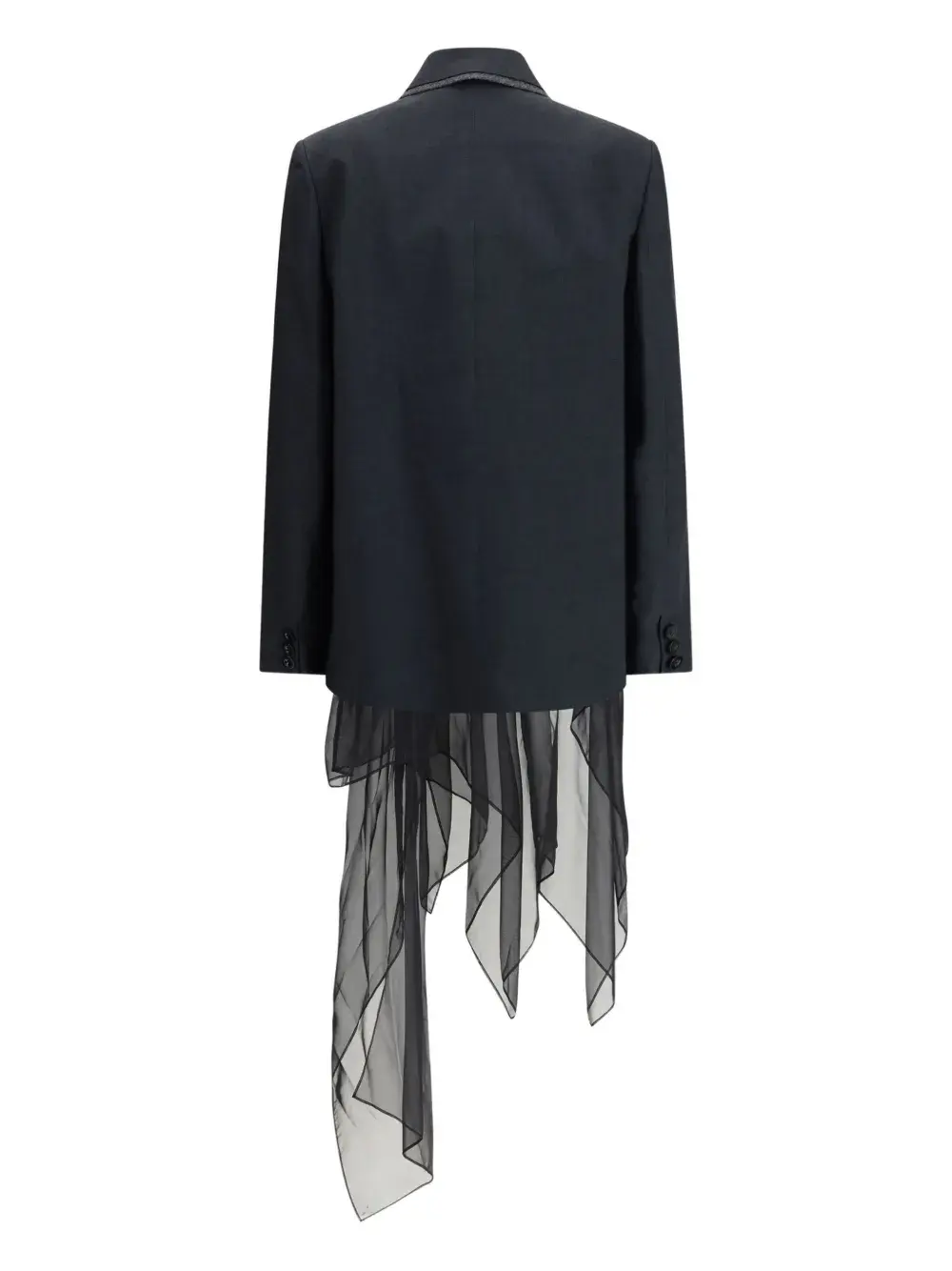серый двубортный пиджак с деталями из тюля, застёжкой на пуговицы, лацканами с острыми концами и клапанами на карманах