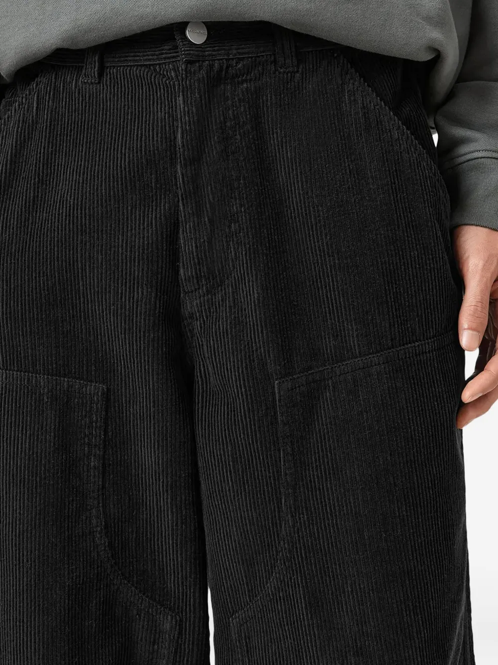 черный вельвет, фактурная поверхность, накладные карманы спереди, накладные карманы сзади, боковой карман-«карго», вставка на колене