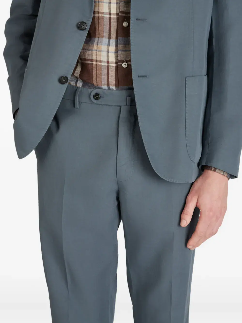 синий однобортный пиджак, застёжка на пуговицы, накладные карманы, шлевки для пояса