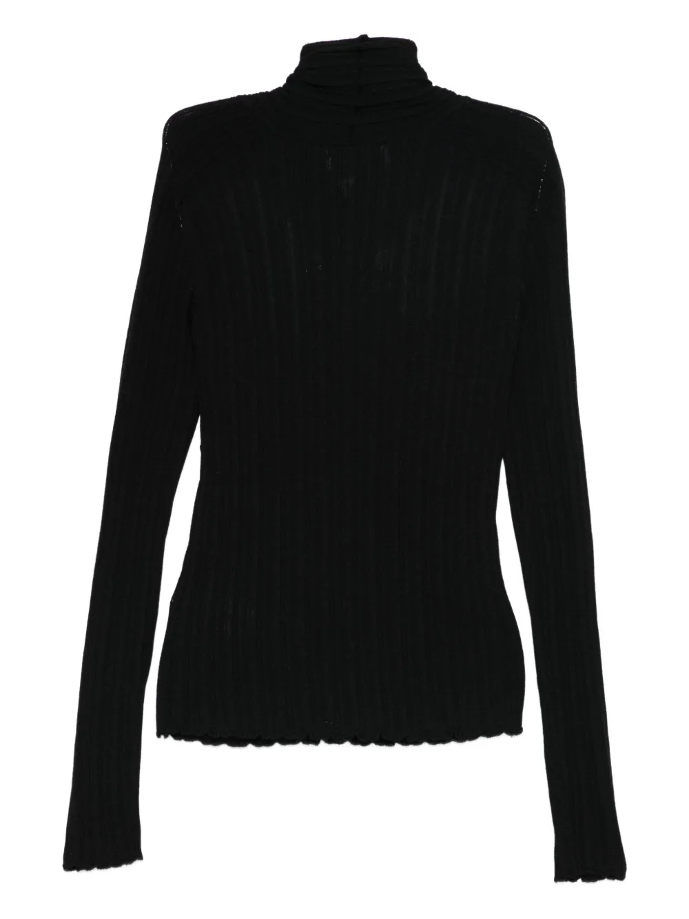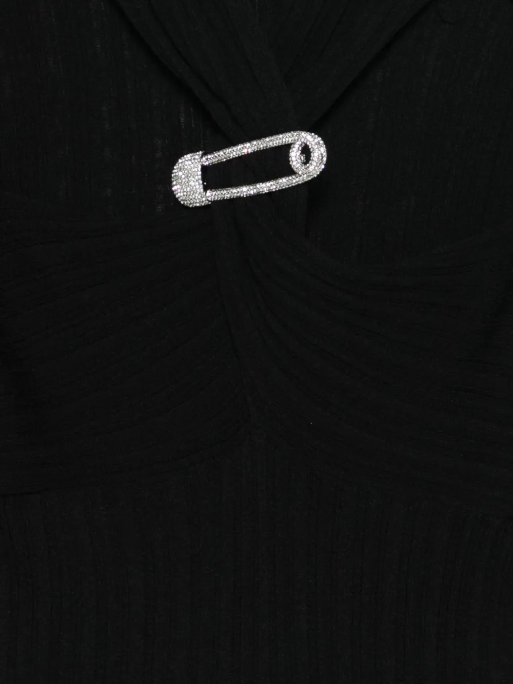 черный вязаный топ в рубчик с длинными рукавами, вырезом и декоративной булавкой