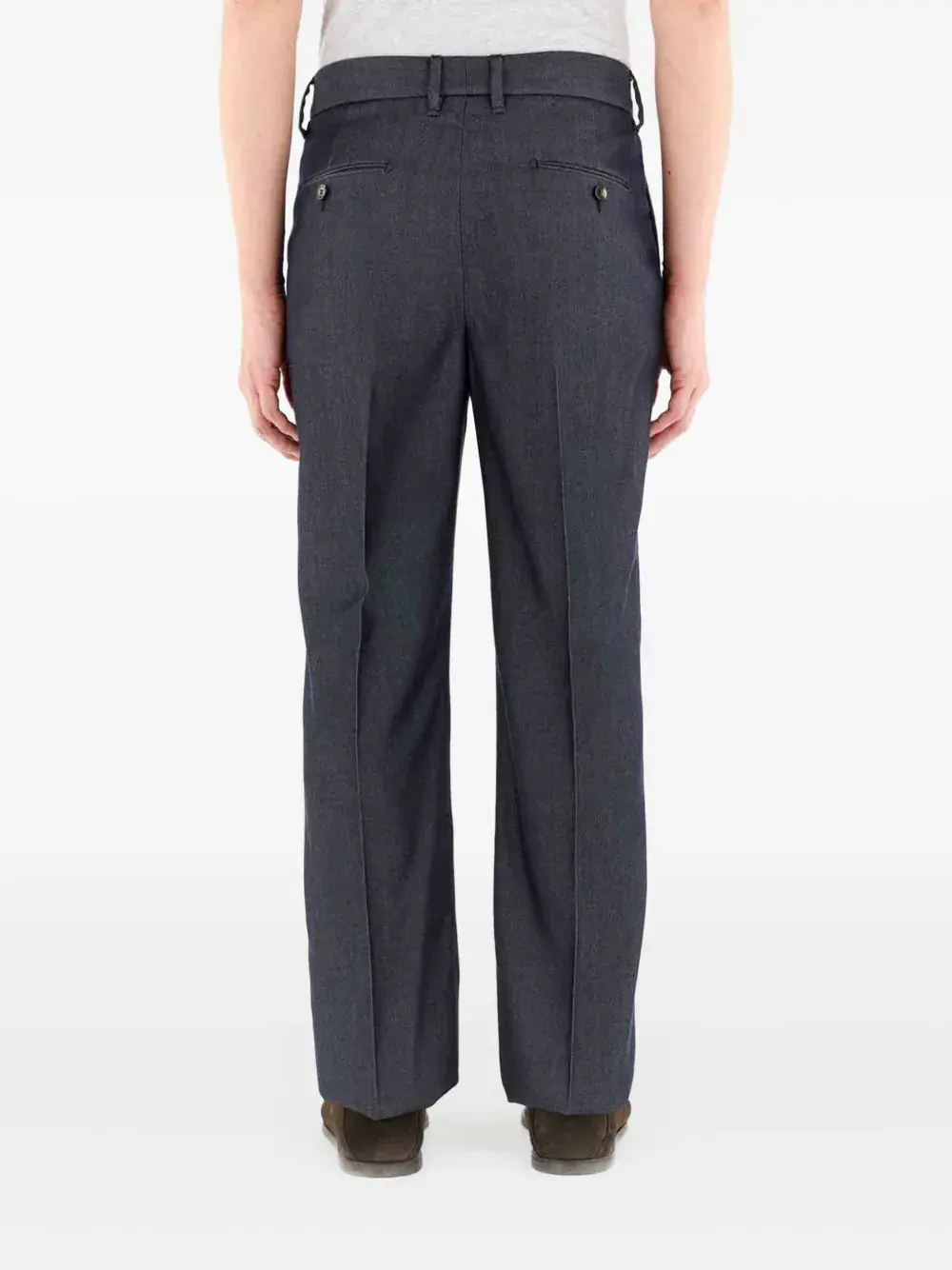 темно-серые шлевки для ремня, скрытая ширинка, задние прорезные карманы, тональная строчка
