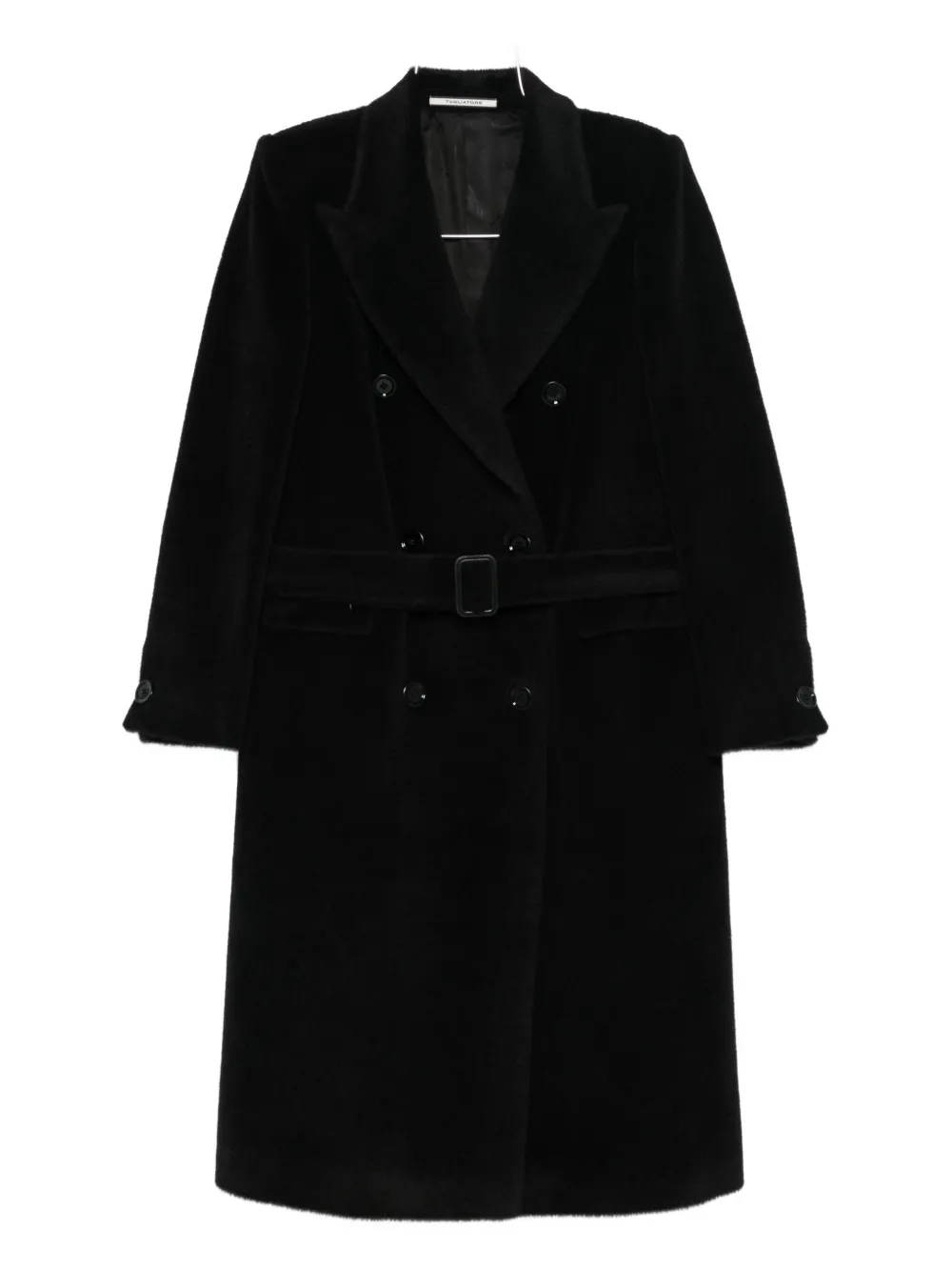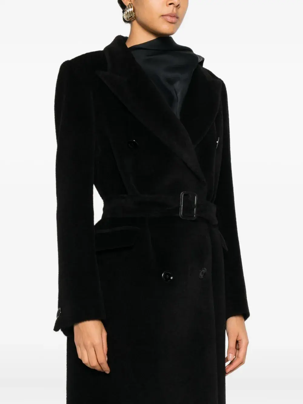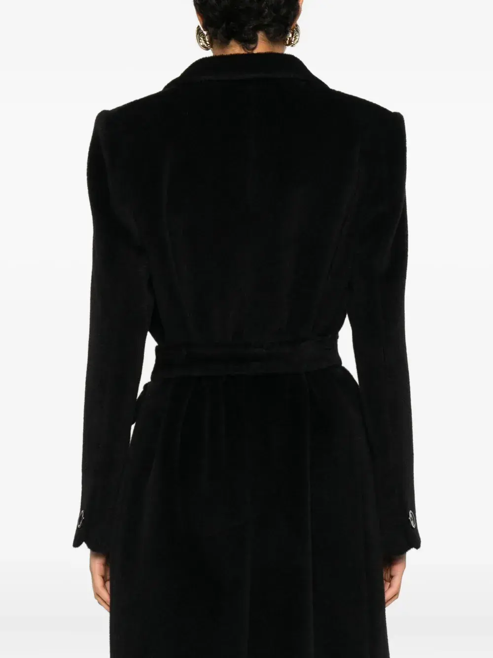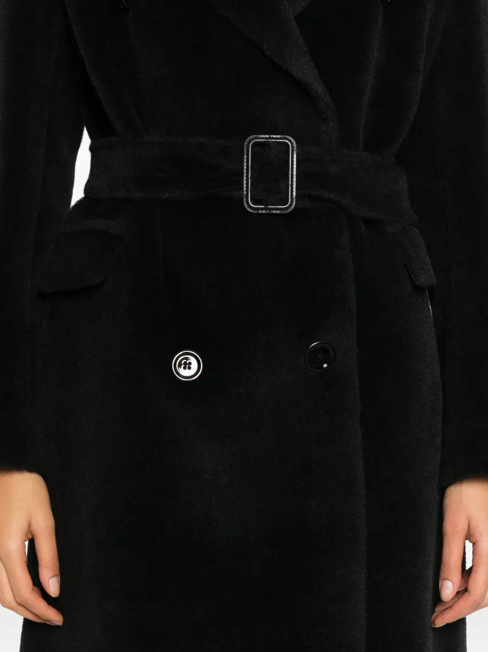 черный двубортный, застежка на пуговицы, лацканы с острыми концами, пояс на талии, накладные карманы спереди