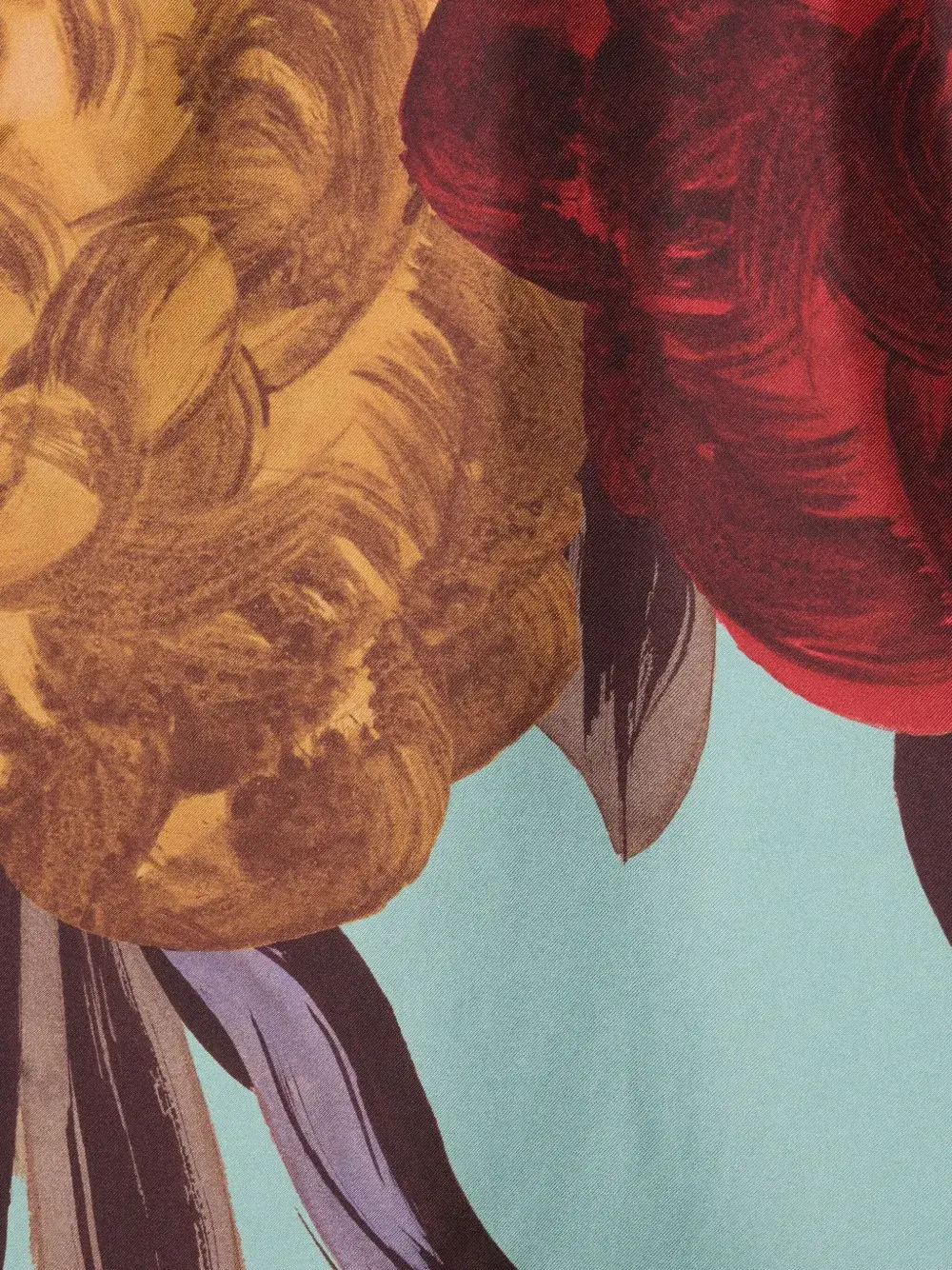 синее шелковое платье с цветочным принтом, длинными рукавами, круглым вырезом и застежкой-молнией