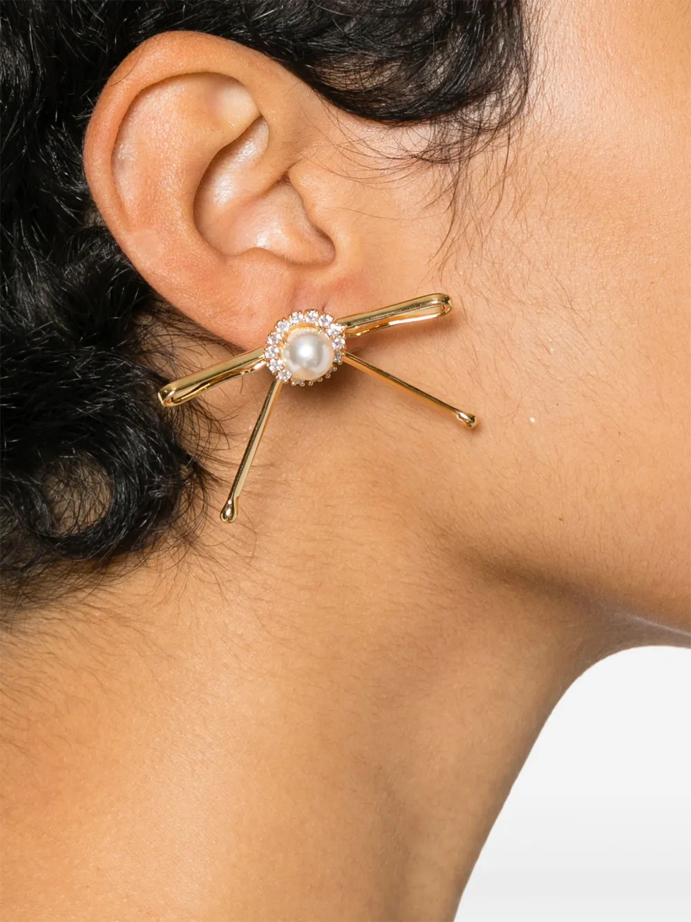 золотистый оттенок, украшенные жемчужиной, декорированные детали, застёжка-гвоздик для проколотых ушей, эти серьги идут в паре