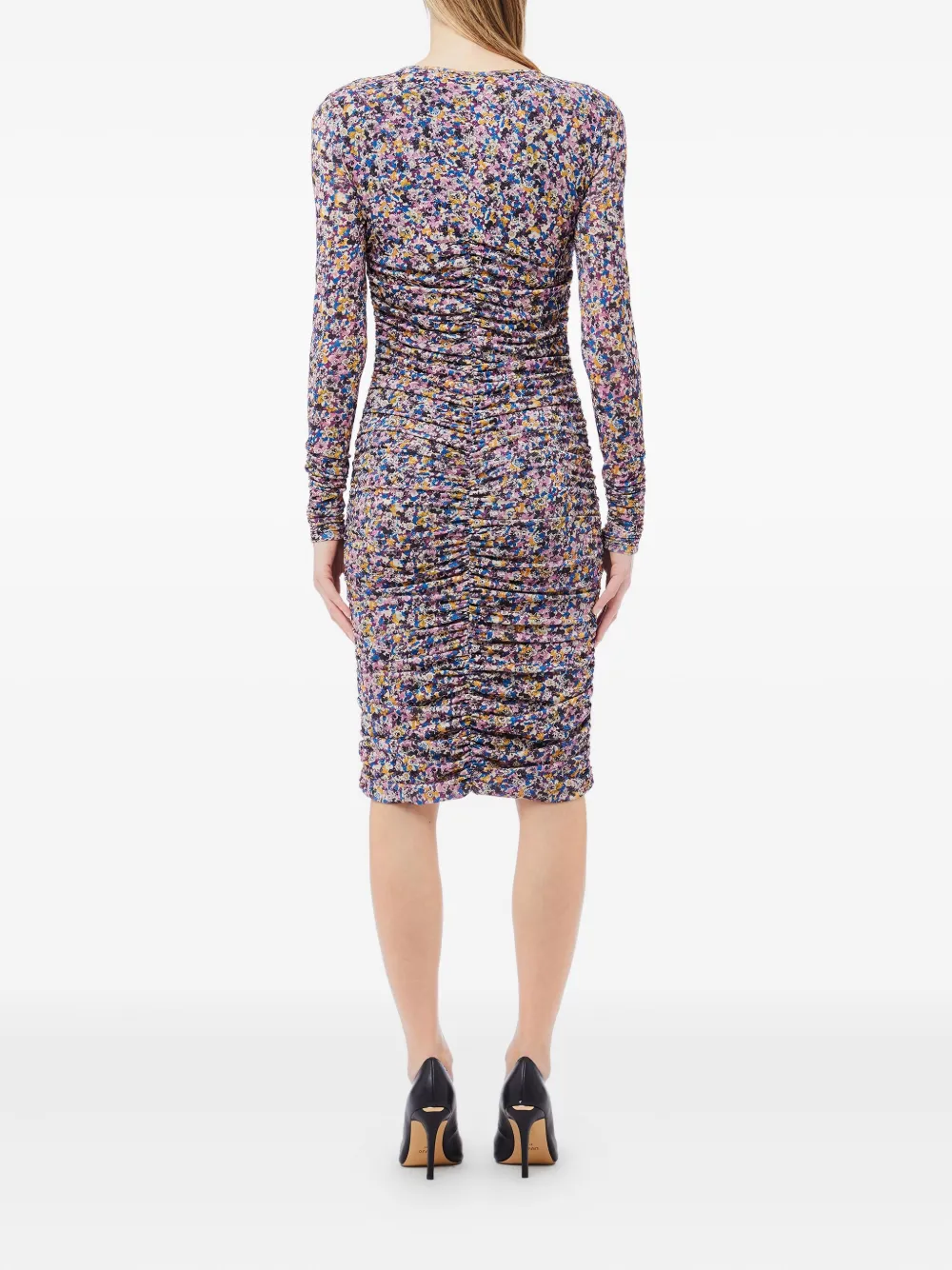 многоцветный цветочный принт, длинные рукава, сборка, V-образный вырез, украшение спереди