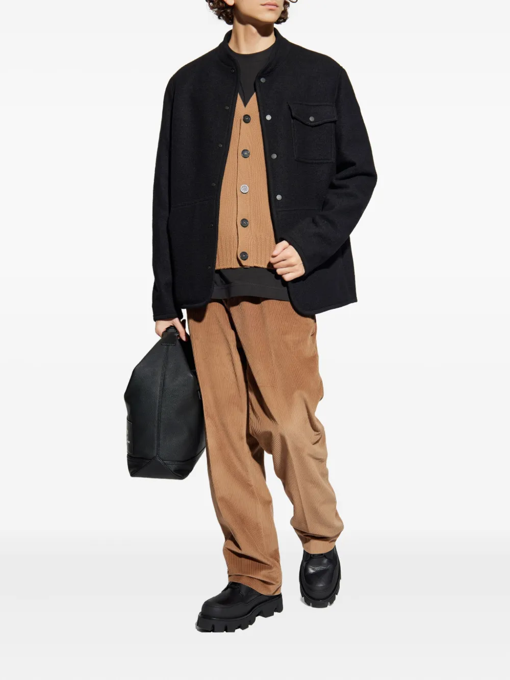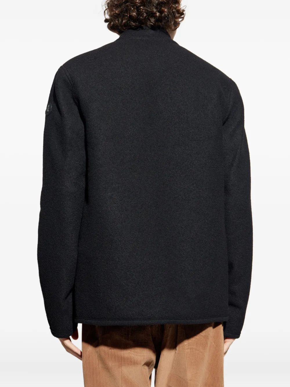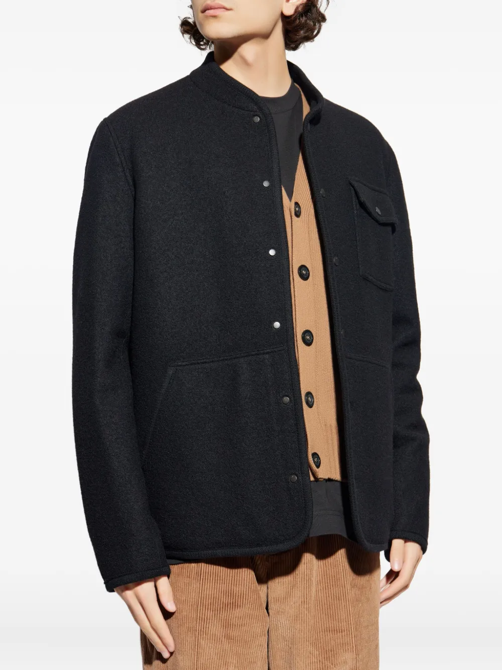 чёрная шерстяная куртка с застёжкой на кнопки, нагрудным карманом, круглым вырезом, длинными рукавами и кожаной нашивкой с логотипом