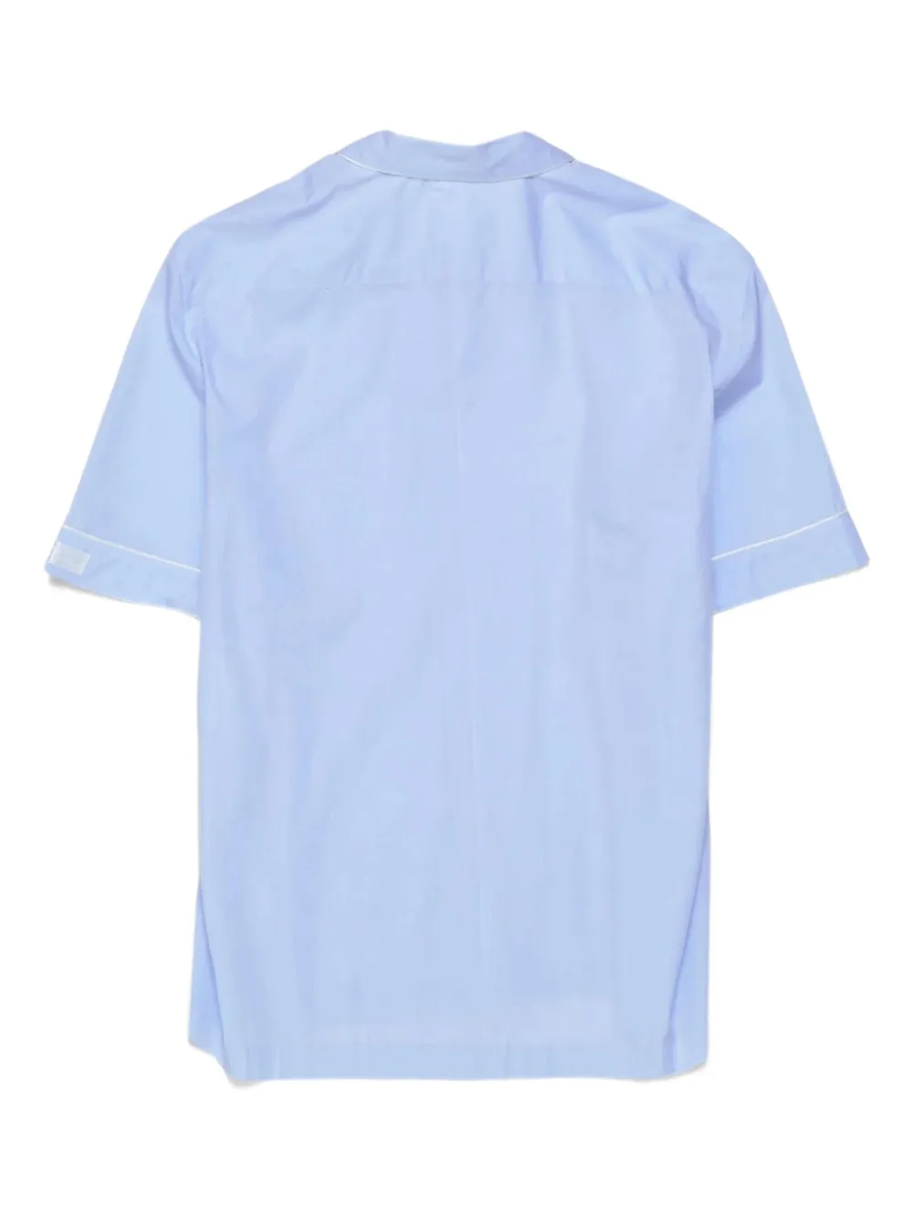 светло-голубая рубашка с нагрудным карманом, застёжкой на пуговицы, короткими рукавами и окантовкой