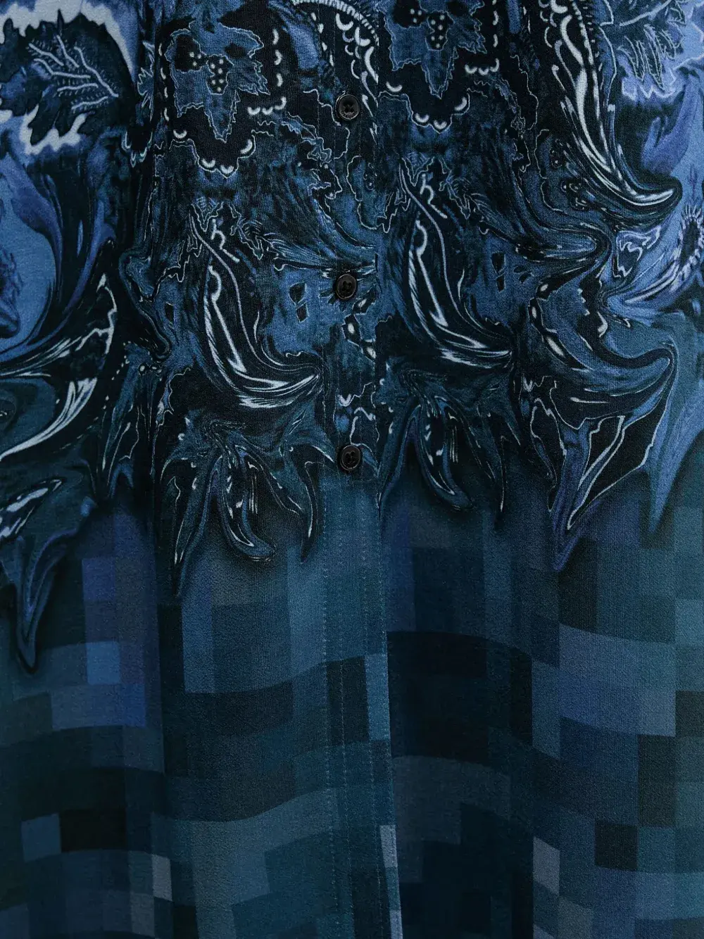 голубая рубашка с цветочным принтом, застежкой на пуговицы, завязками и длинными рукавами, воротник-стойка
