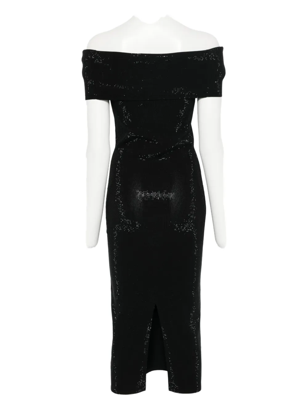 черный цвет, отложной вырез, силуэт с открытыми плечами, длина миди, центральный разрез сзади