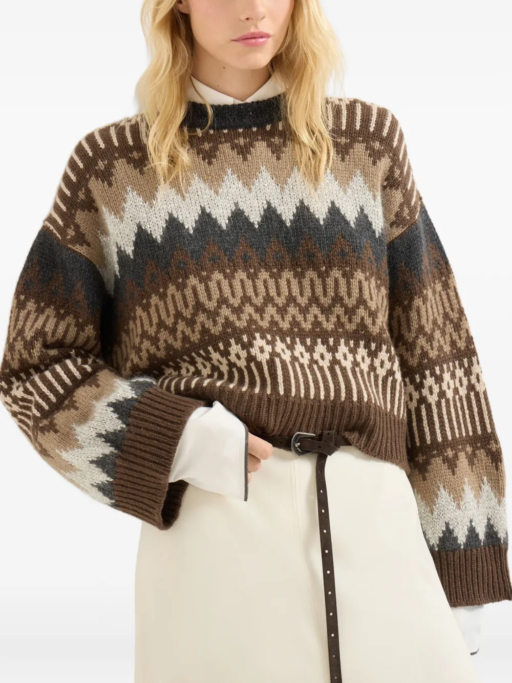 коричневый джаккардовый узор, круглый вырез, ребристая отделка, вязаная конструкция