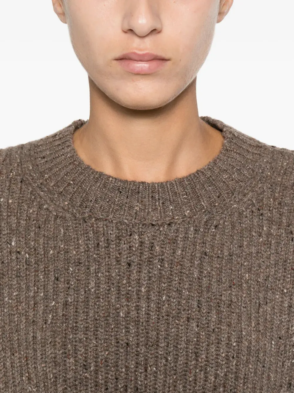коричневый ребристый вязаный джемпер с круглым вырезом, длинными рукавами и крапчатым узором