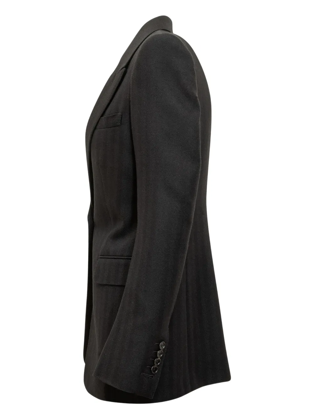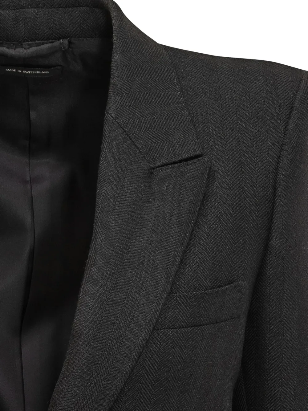 черный пиджак с лацканами с вырезом, на одной пуговице, с манжетами на пуговицах