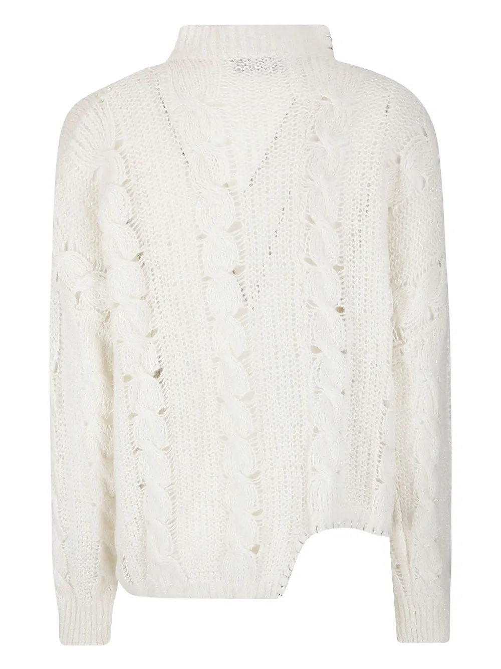 белый свитер с косичками, асимметричным подолом, высоким воротом и длинными рукавами