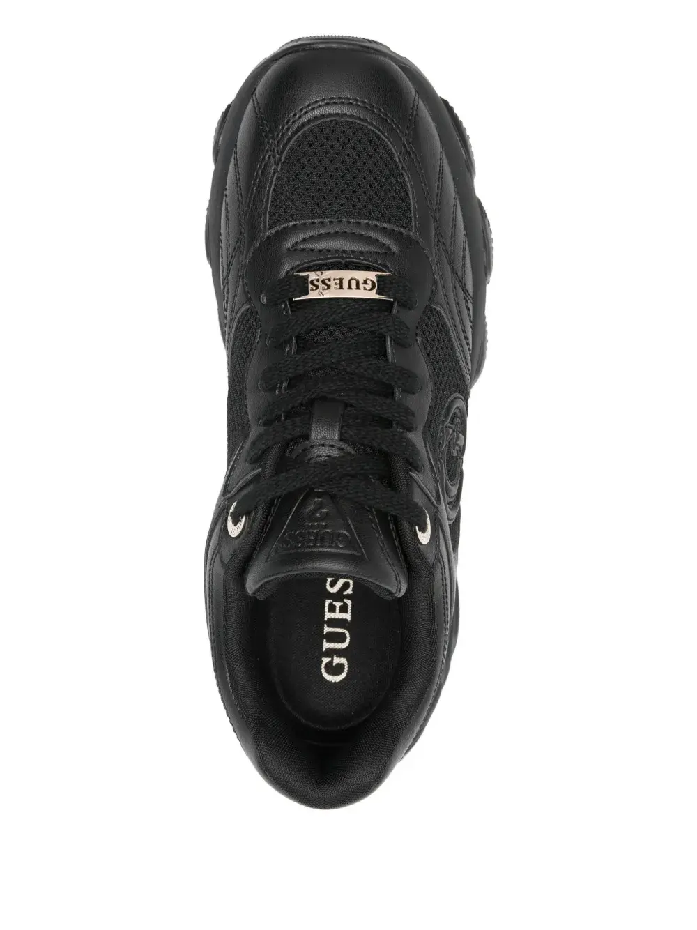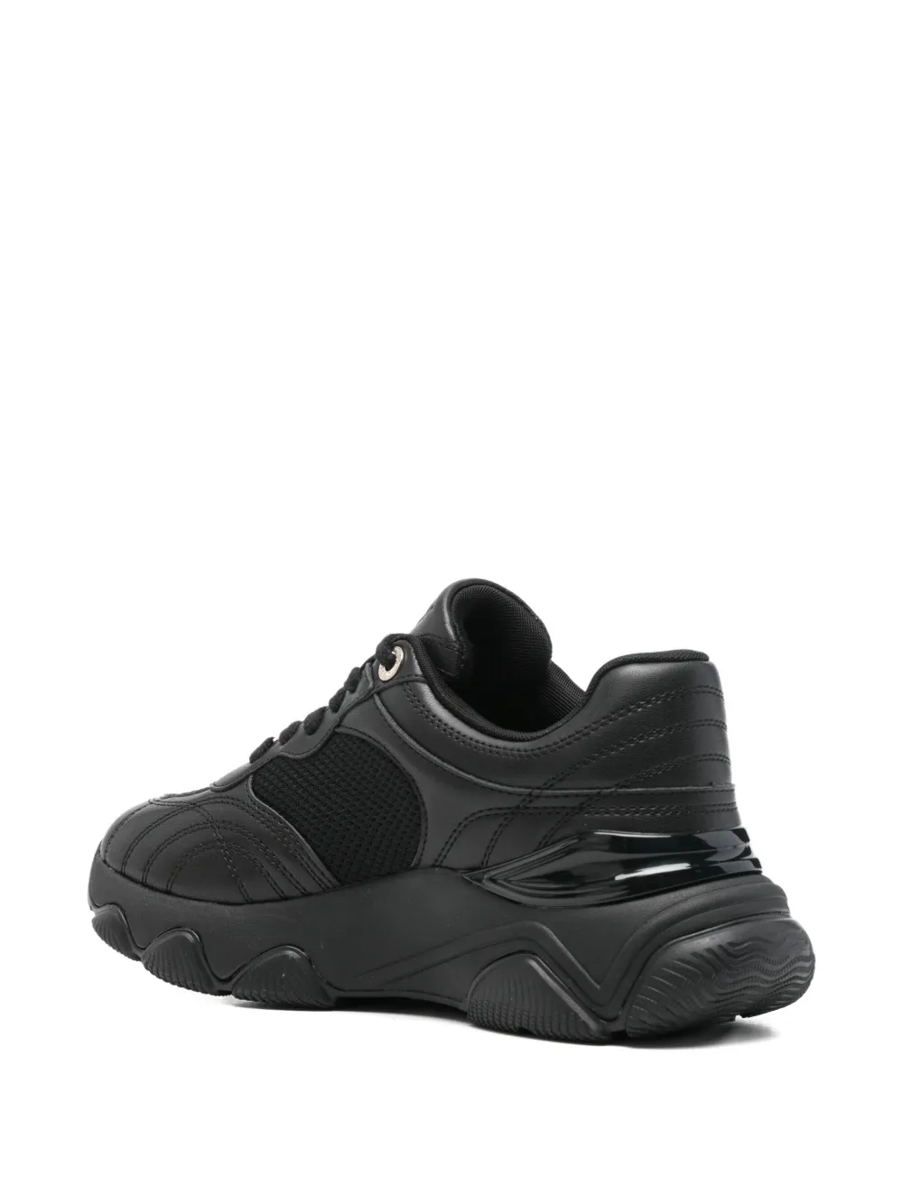 чёрные кроссовки с нашивкой-логотипом, сетчатыми панелями, рифлёной подошвой, шнуровкой и круглым носком