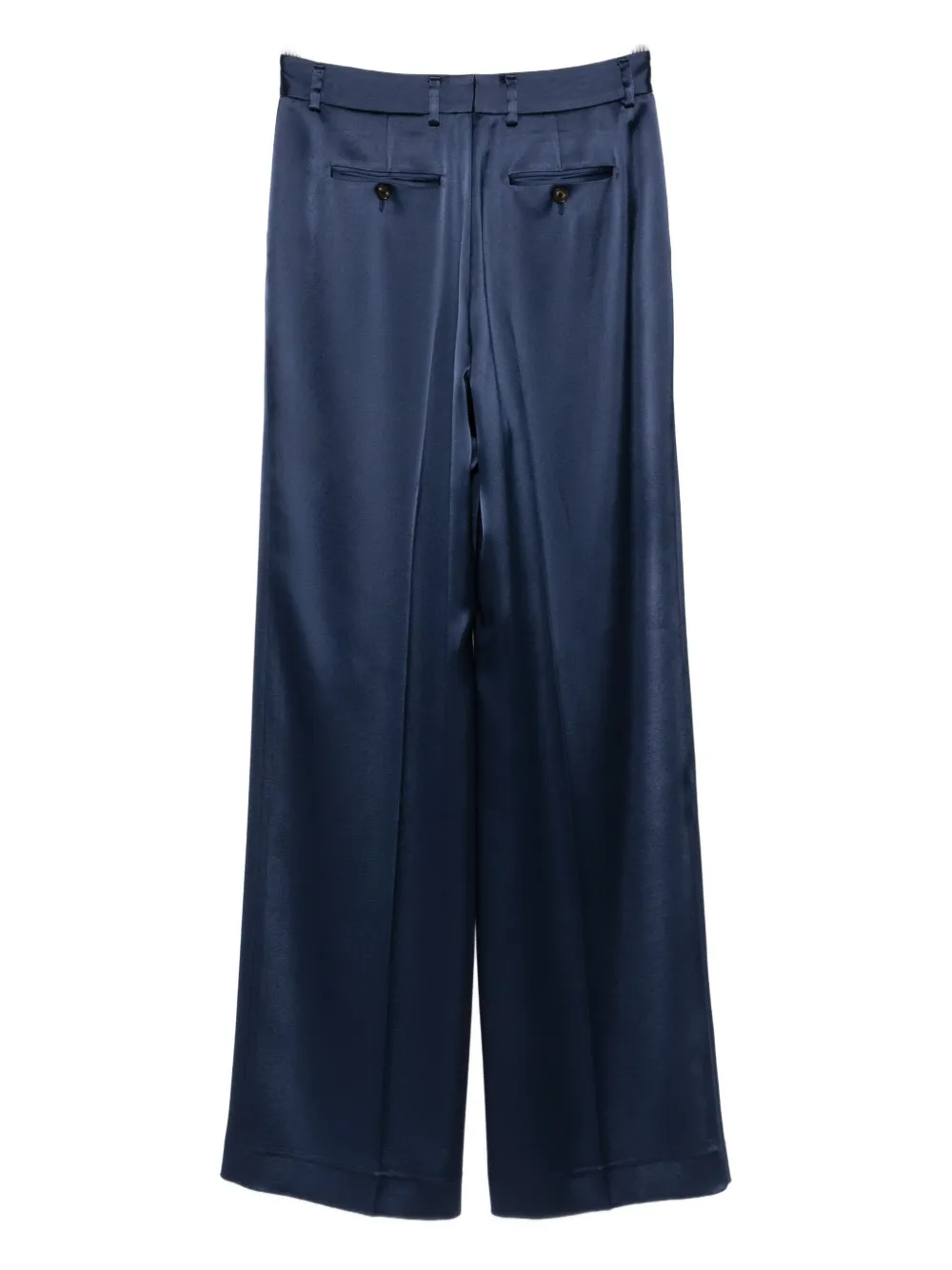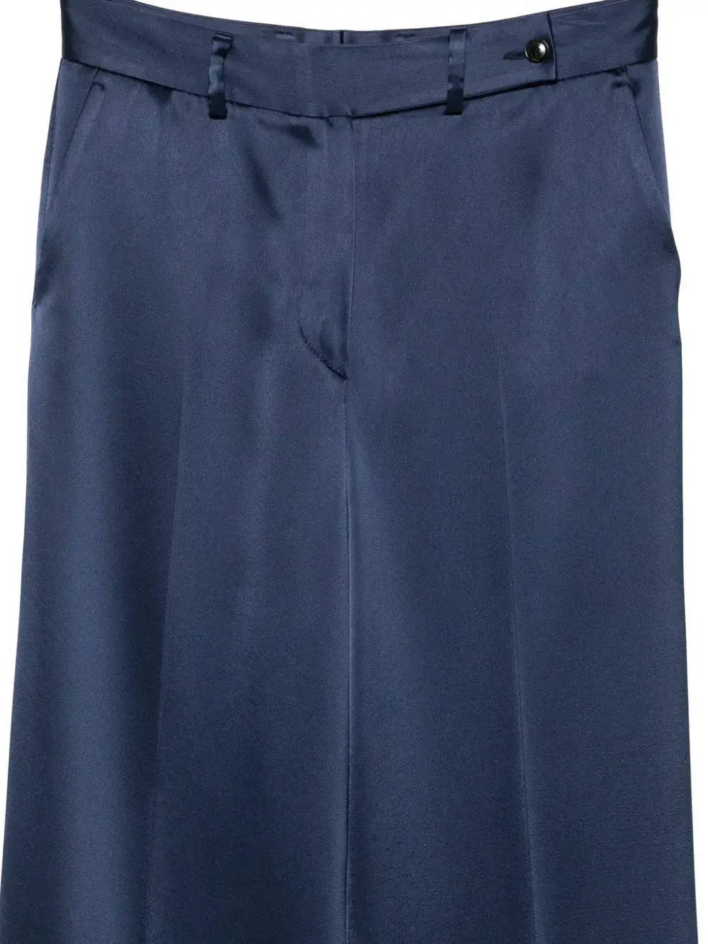 синие брюки с застежкой на молнию и пуговицу спереди и боковыми карманами