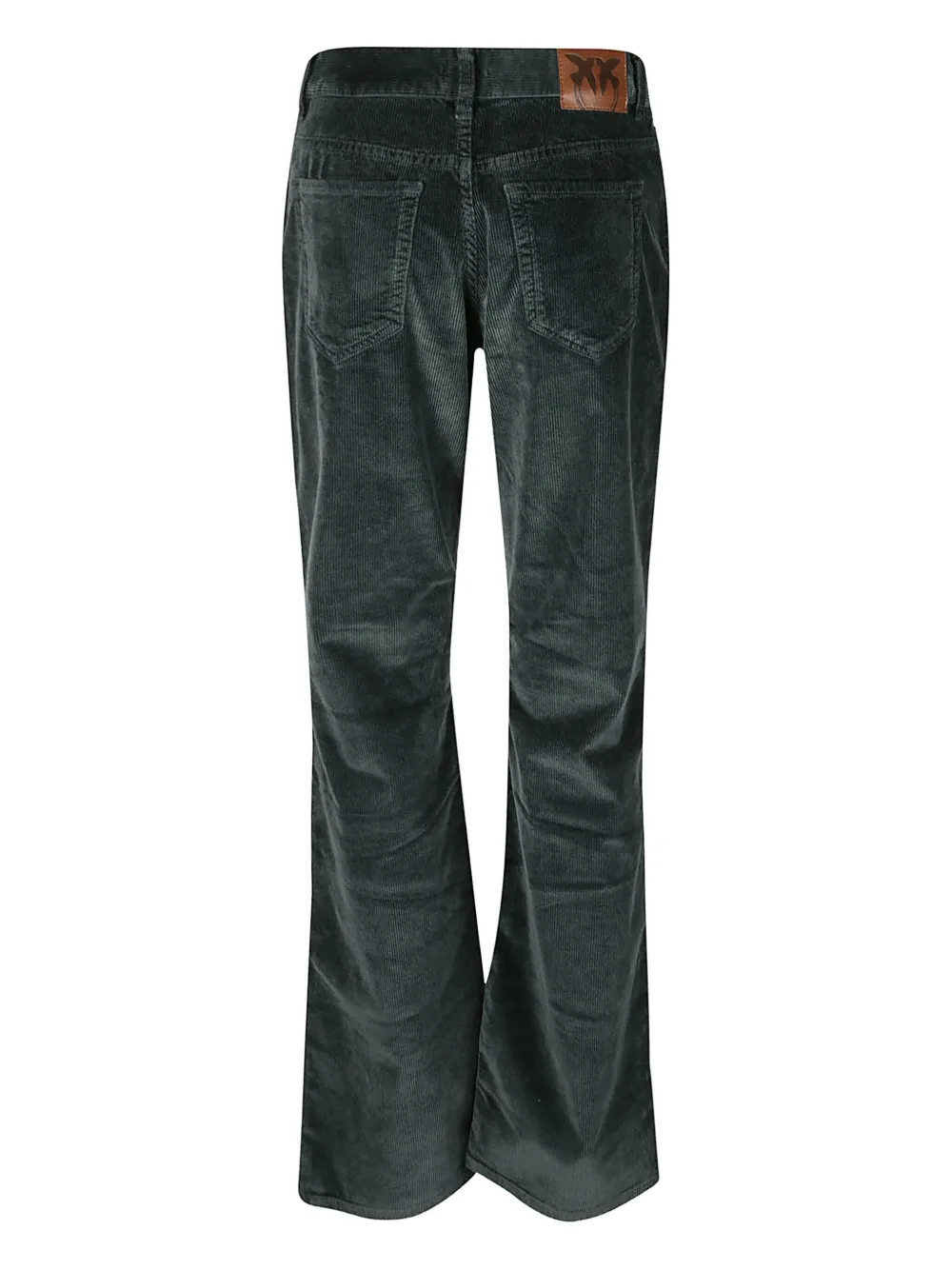 зелёный вельветовый материал, шлёвки для ремня, классические пять карманов, логотип, скрытая застёжка спереди