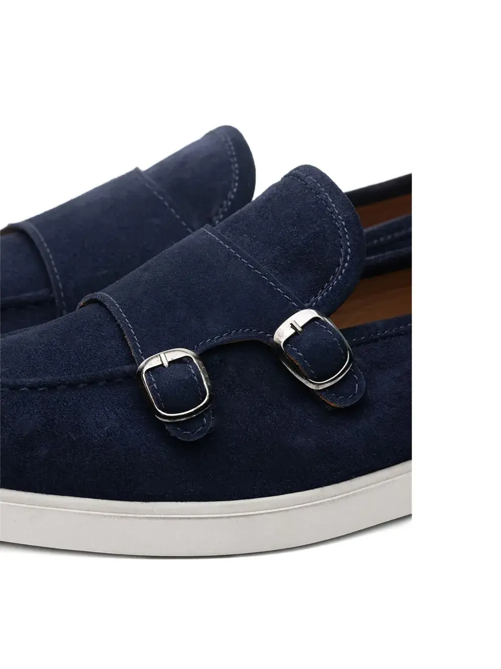 темно-синие туфли с двумя пряжками, контрастной прострочкой, круглым носком и плоской подошвой