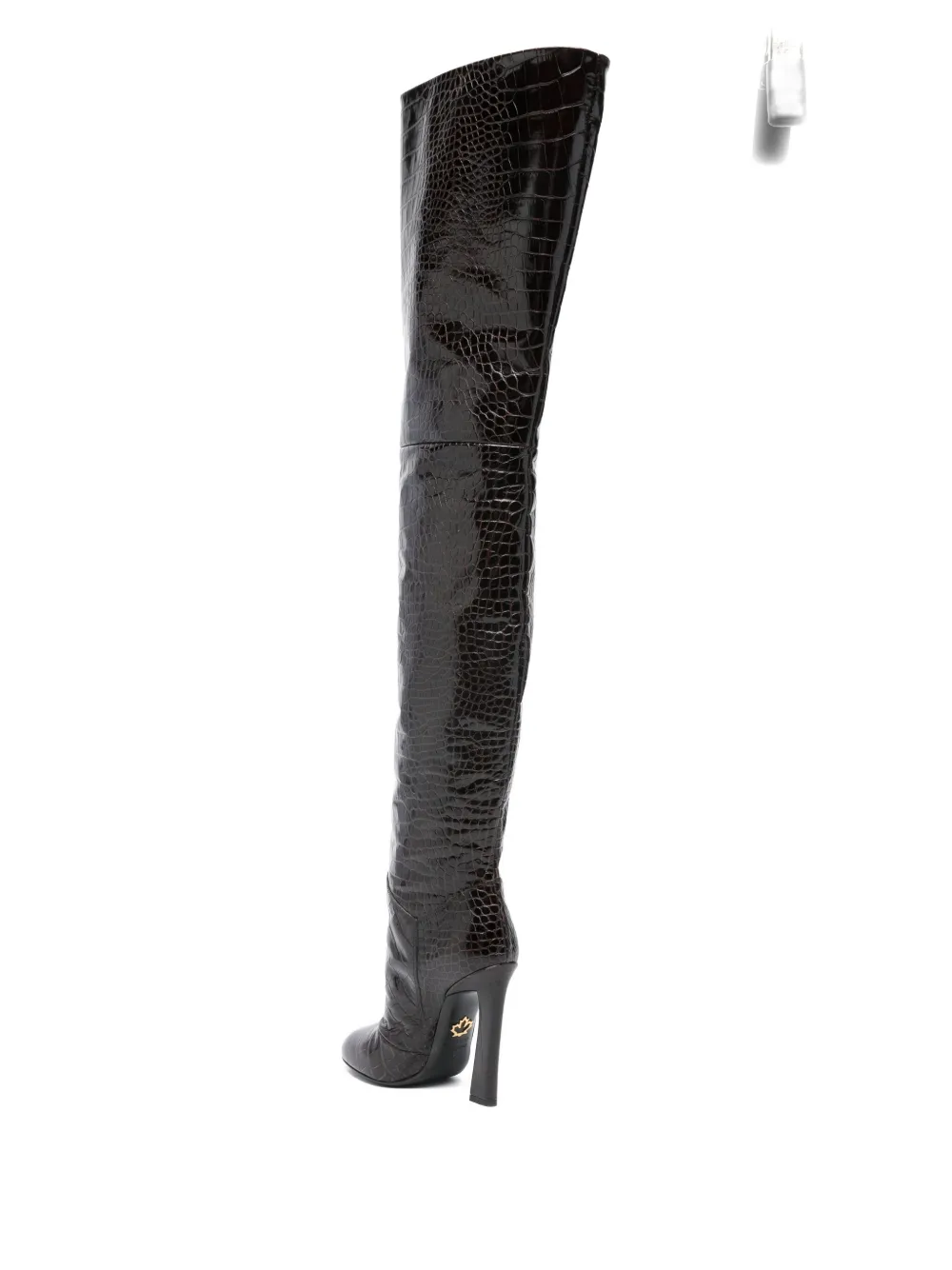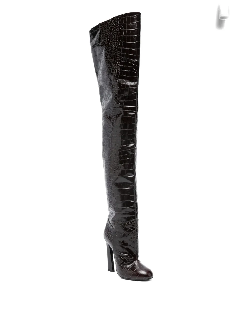 коричневые ботфорты с эффектом крокодиловой кожи на массивном каблуке и острым носком
