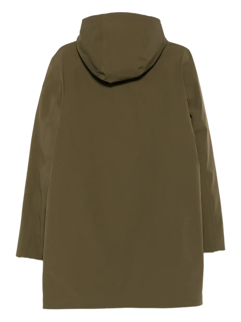 светло-зеленая куртка с капюшоном, застежкой на пуговицы, застежкой-молнией, длинными рукавами и прямым подолом