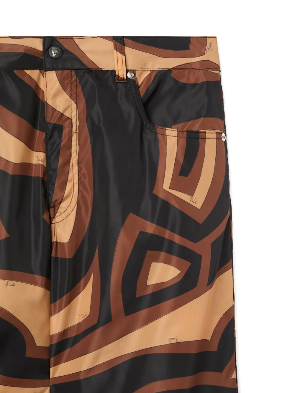 коричневый/с разноцветным принтом-лабиринтом, боковые клапанные карманы, шлевки для ремня, задние прорезные карманы, застежка на пуговицу