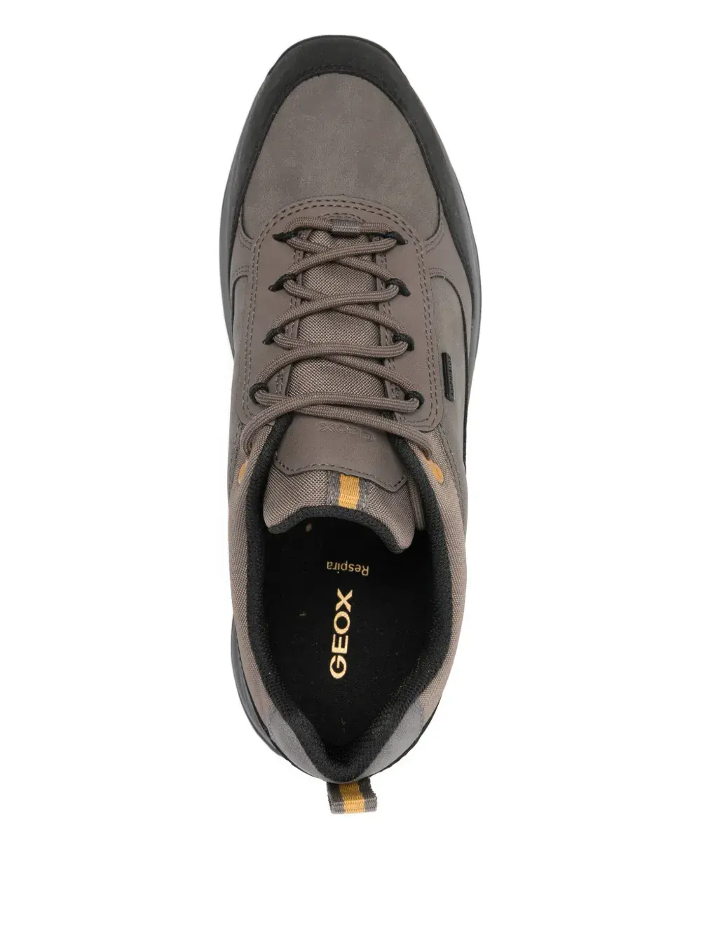 верх из серой кожи, шнуровка, петля для подтягивания, резиновая подошва, тональная строчка