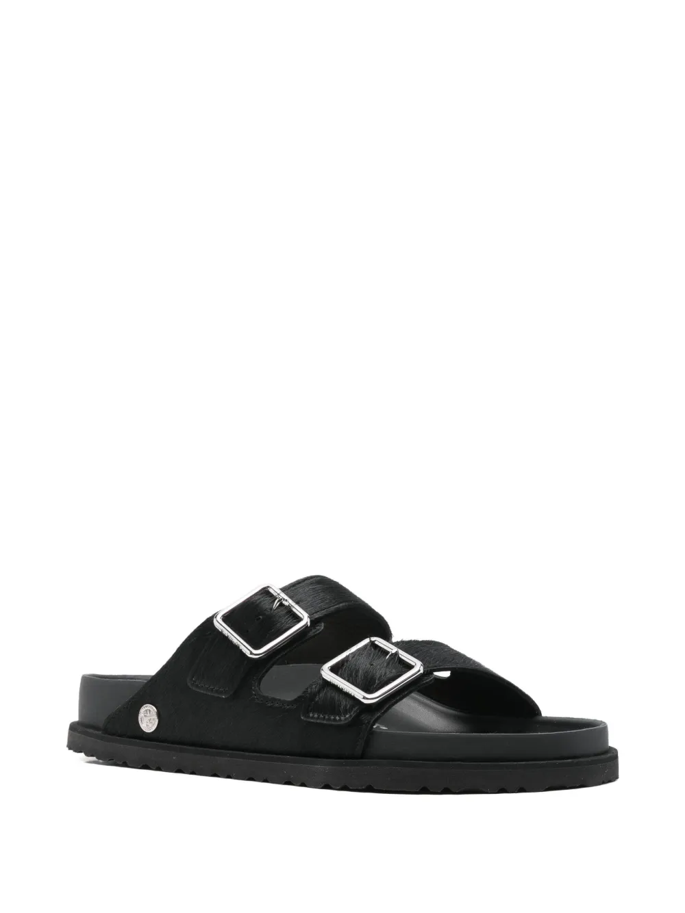 черные с двумя ремешками на пряжке, фурнитура серебристого цвета, плоская подошва, круглый носок